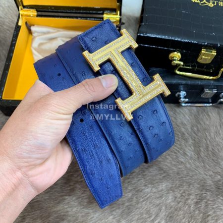Hermes Ostrich Skin Diamond Gold H Buckle 38mm Belt For Men Blue