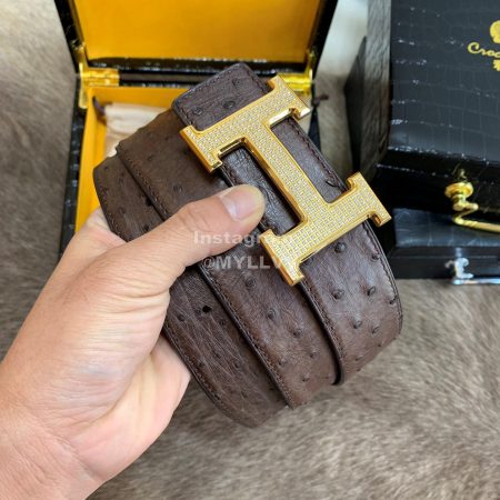Hermes Ostrich Skin Diamond Gold H Buckle 38mm Belt For Men Brown
