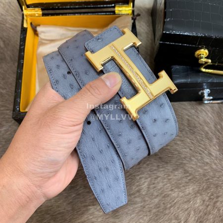 Hermes Ostrich Skin Diamond Gold H Buckle 38mm Belt For Men Gray