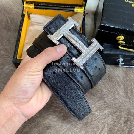 Hermes Ostrich Skin Diamond Gold H Buckle 38mm Belt For Men Black