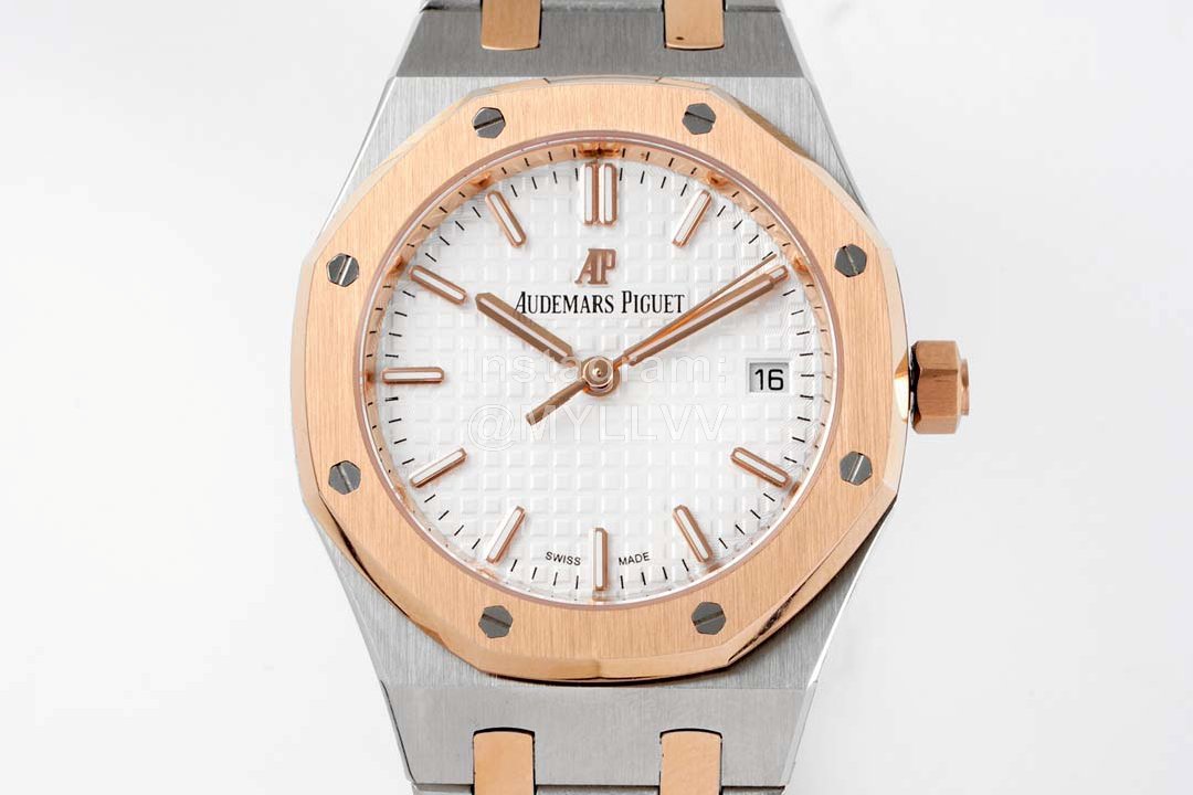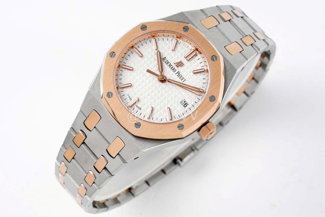 8F’s new 34mm diameter Royal Oak series automatic chain wristwatch reproduces the avant-garde style of this legendary series with a new case size, and deduces a different elegant style for the wearer of slender wrists. All new watches are equipped with 9015 calibre 5800 automatic chain movement, and adopt rose gold automatic pendulum specially designed for this style.