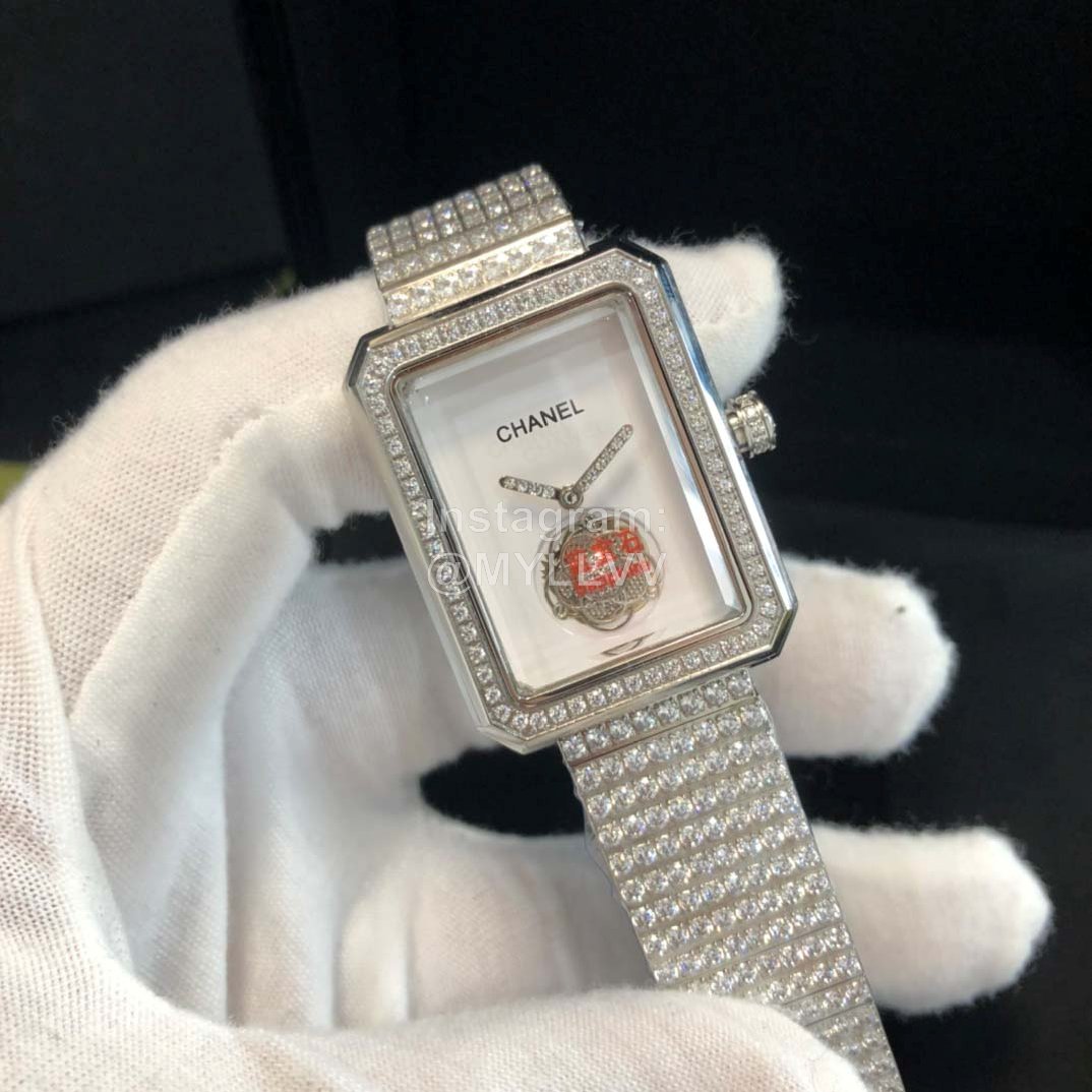 Chanel, Premier series Camellia hollow out wristwatch counter high-end highest quality version Chanel premier series, unique Camellia flywheel design. In order to be closer to the original watch case, watch needle, watch buckle and watch crown, bright cutting gemstones are inlaid with unique technology to highlight the temperament. The case is 2734mm, and the mirror adopts 3D cutting beveled sapphire glass. Equipped with Chanel homemade movement calibre 2 Camellia petals unfold gracefully on the movement. The classic totem of Chanel brand is combined with advanced watchmaking skills. The case uses the outline of Fangdeng square in Paris, the capital of fashion. The geometric hollowed movement outlines the elegant black power of Camellia, just as Coco Chanel said that it can sweep all things. The charming charm of this diamond shining black premi è re hollowed Camellia wristwatch have no bottom!