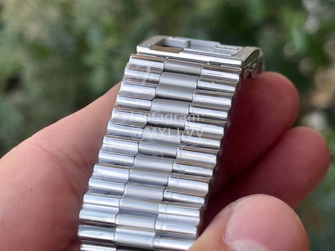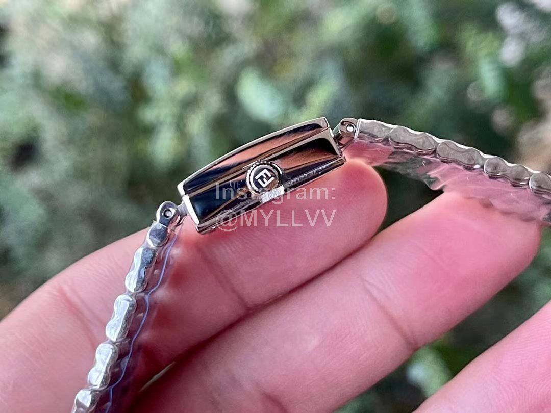 Polished stainless steel logo FF bezel and stainless steel case. White painted dial with 2 diamonds at 12 o’clock and 6 o’clock, polished stainless steel chain, satin brushed central link and stainless steel buckle.