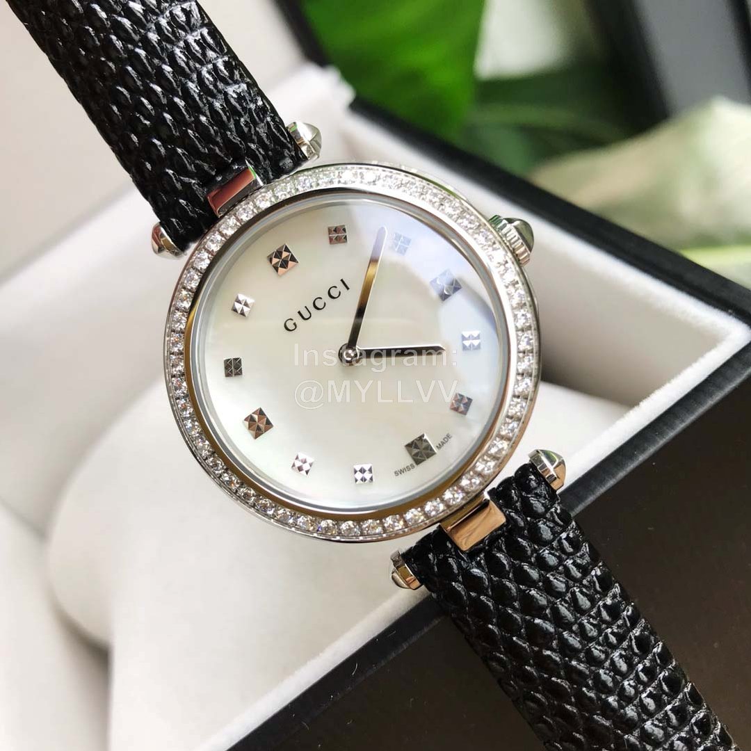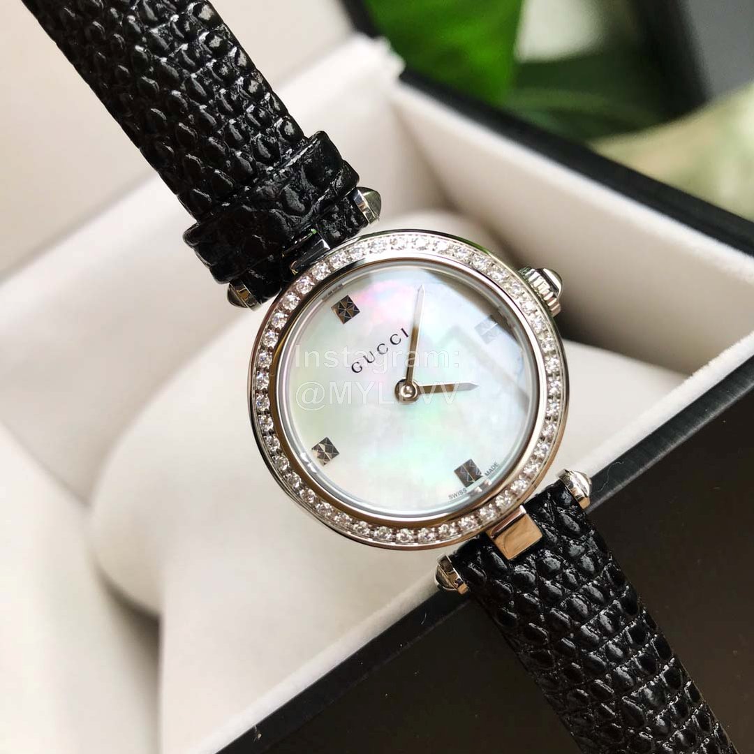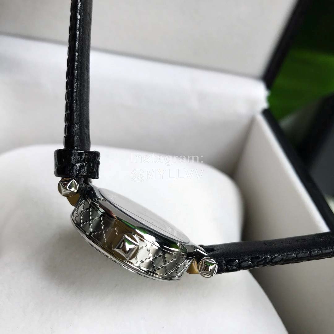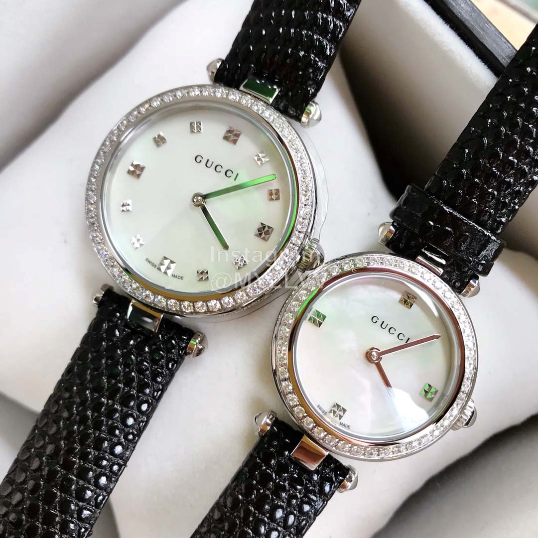 Gucci classic style, necessary for Goddess white-collar workers, scratch resistant sapphire mirror and diamond pattern dial, hollow carving process that can not be imitated, rich in hierarchical three-dimensional texture. Each watch bottom cover has an independent number, 32mm-27mm dial diameter. Soft calf leather clings to the arm for comfort. Unique design, gucci logo on glass, 50m waterproof