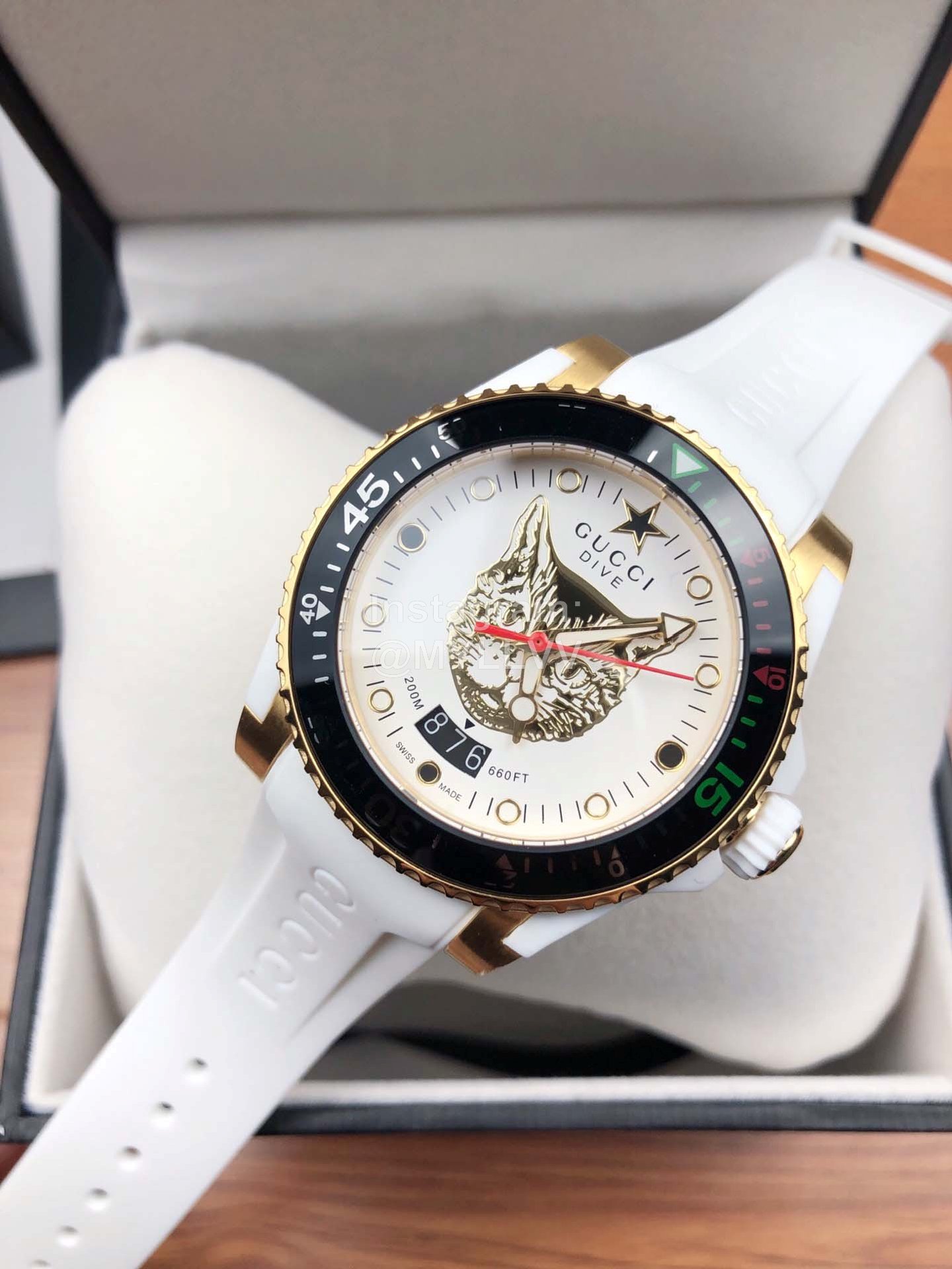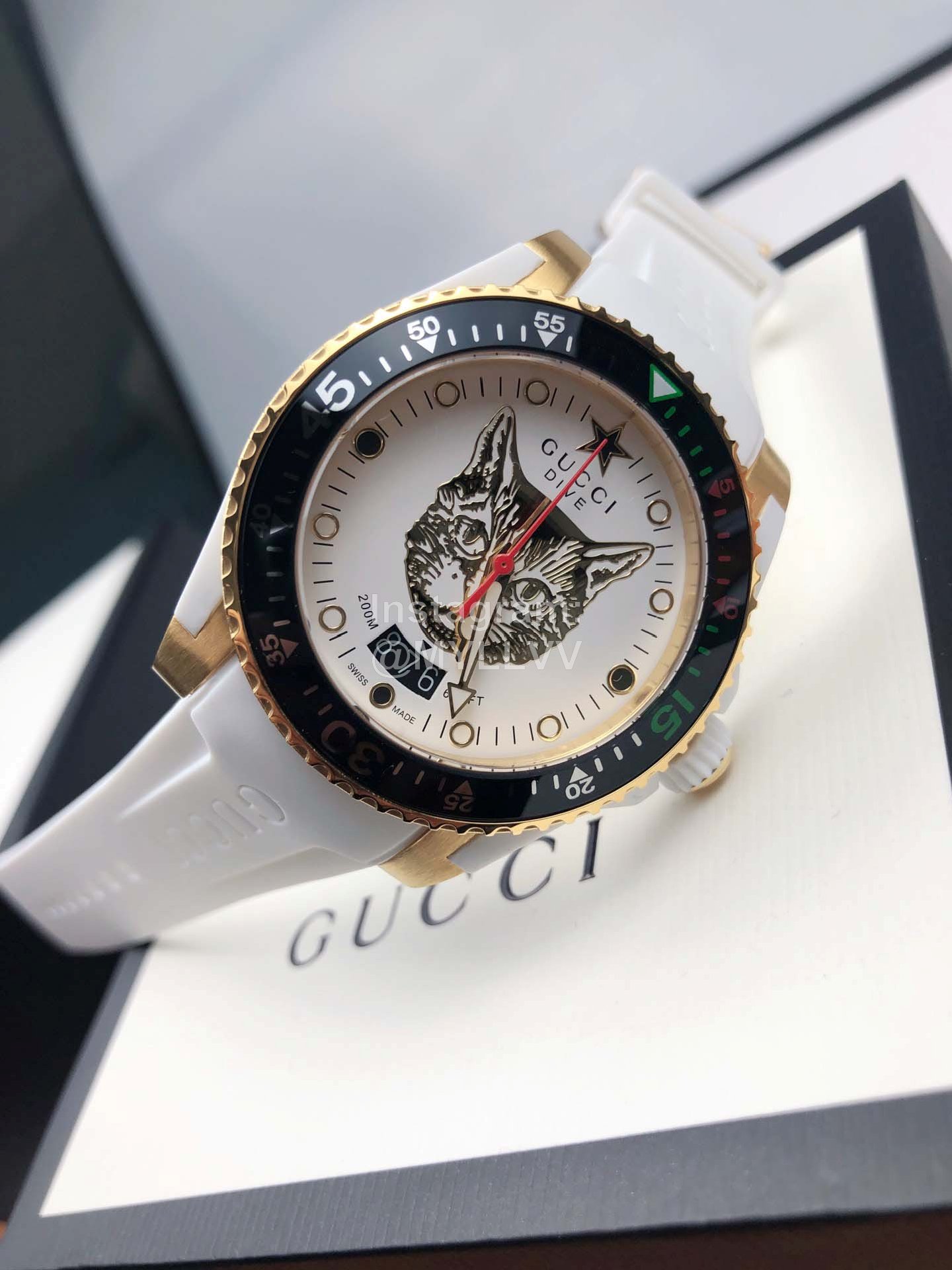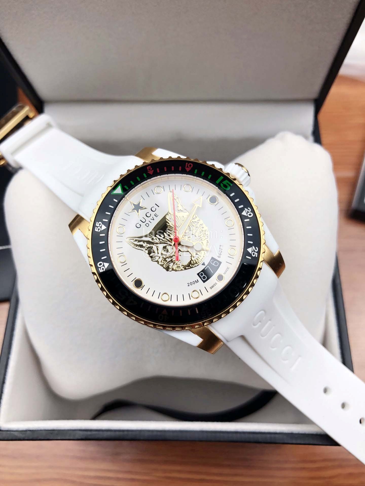 Gucci’s new neutral diving watch, 40 mm diameter, with the brand’s iconic tiger head pattern and luminous display as the dial. It is made of stainless steel, polished by Satin drawing, and matched with a rubber strap with the same color matching with the dial. The dial rotates in one direction, and the ring is also decorated with fluorescent time scale, which can count down the diving. Swiss ETA quartz movement, waterproof depth up to 200m
