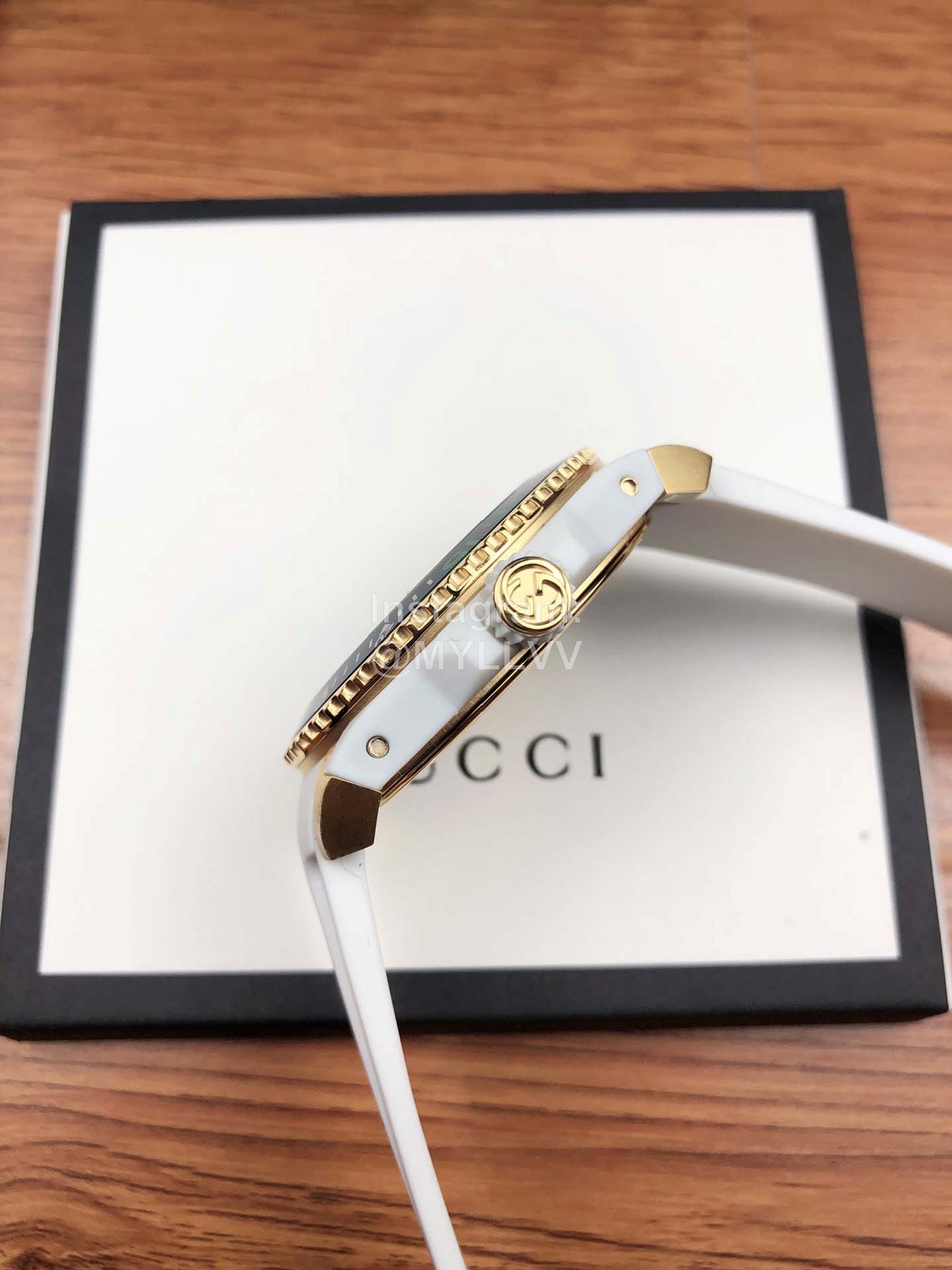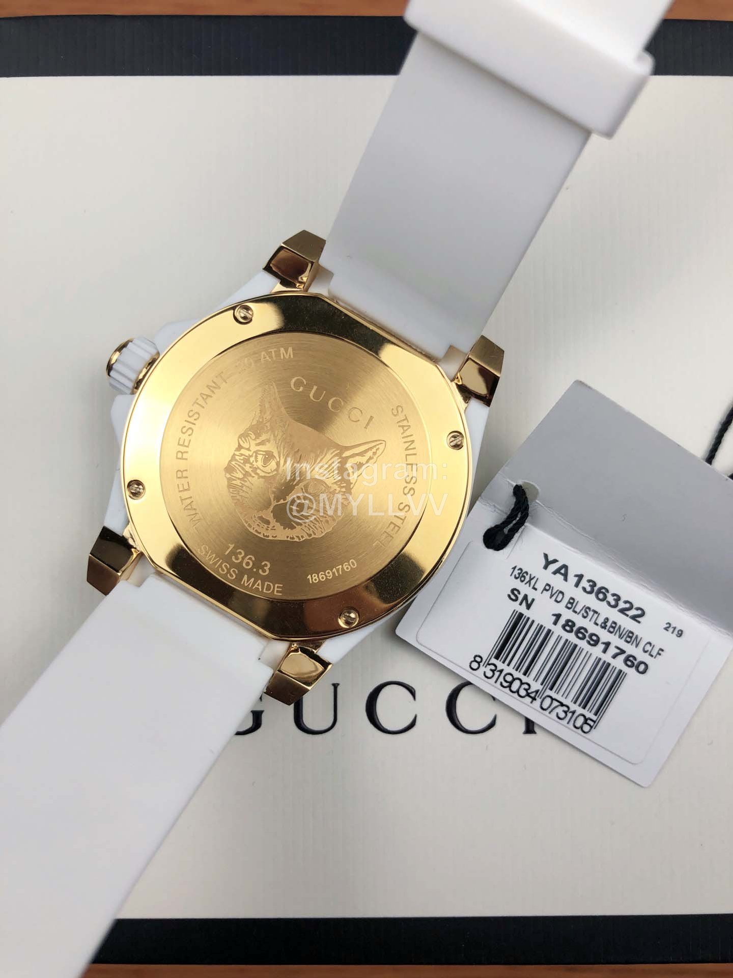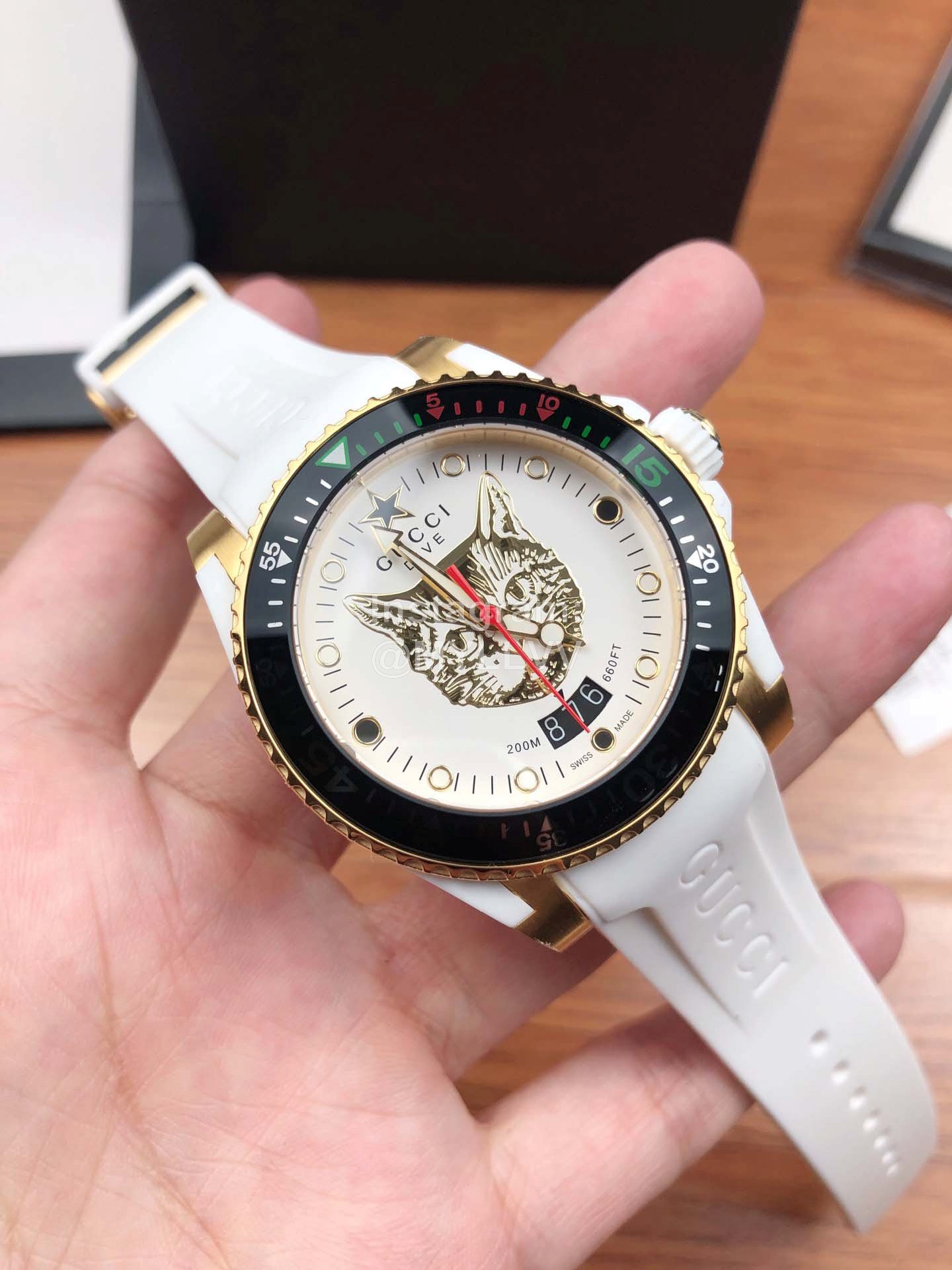 Gucci’s new neutral diving watch, 40 mm diameter, with the brand’s iconic tiger head pattern and luminous display as the dial. It is made of stainless steel, polished by Satin drawing, and matched with a rubber strap with the same color matching with the dial. The dial rotates in one direction, and the ring is also decorated with fluorescent time scale, which can count down the diving. Swiss ETA quartz movement, waterproof depth up to 200m