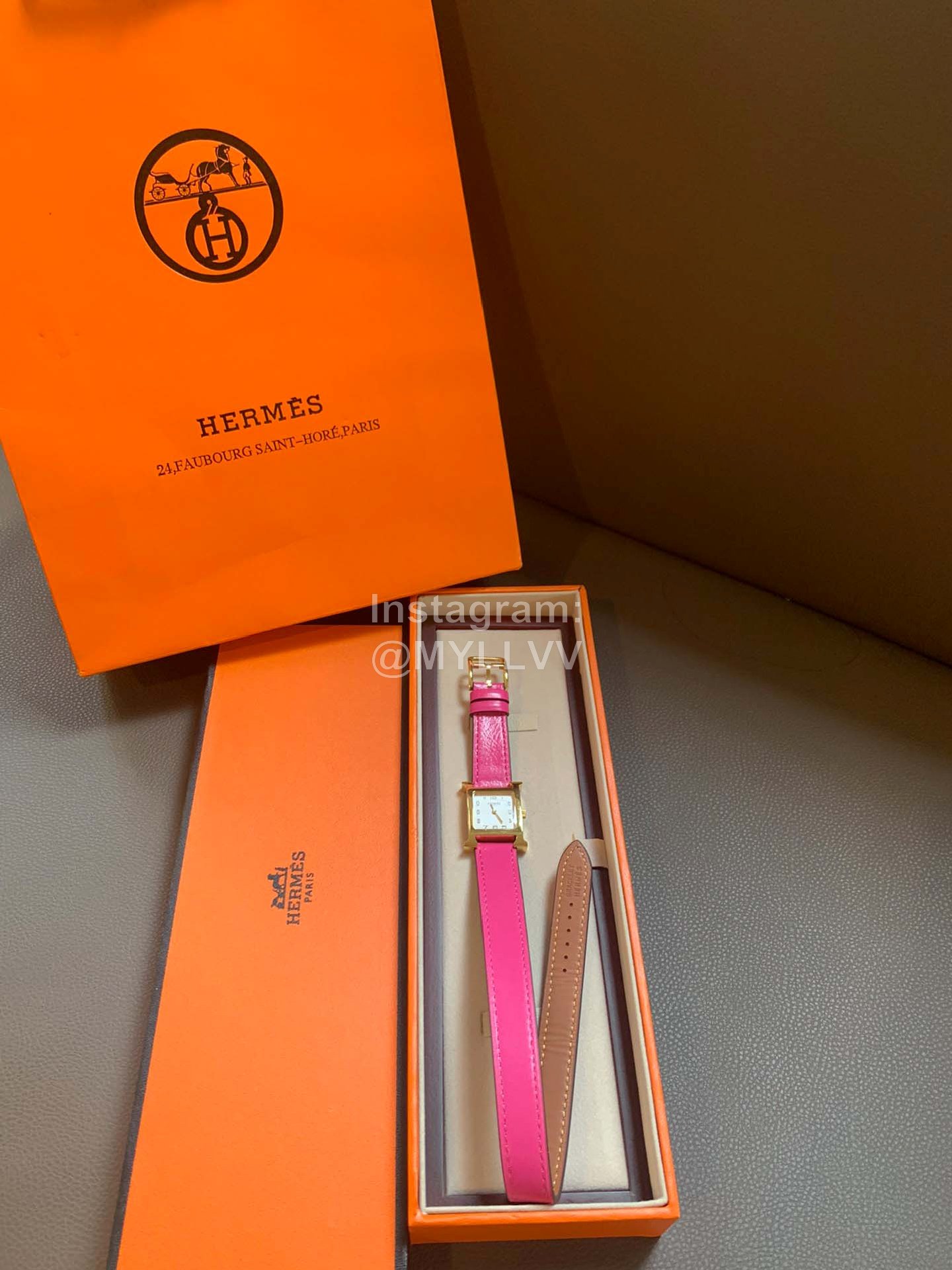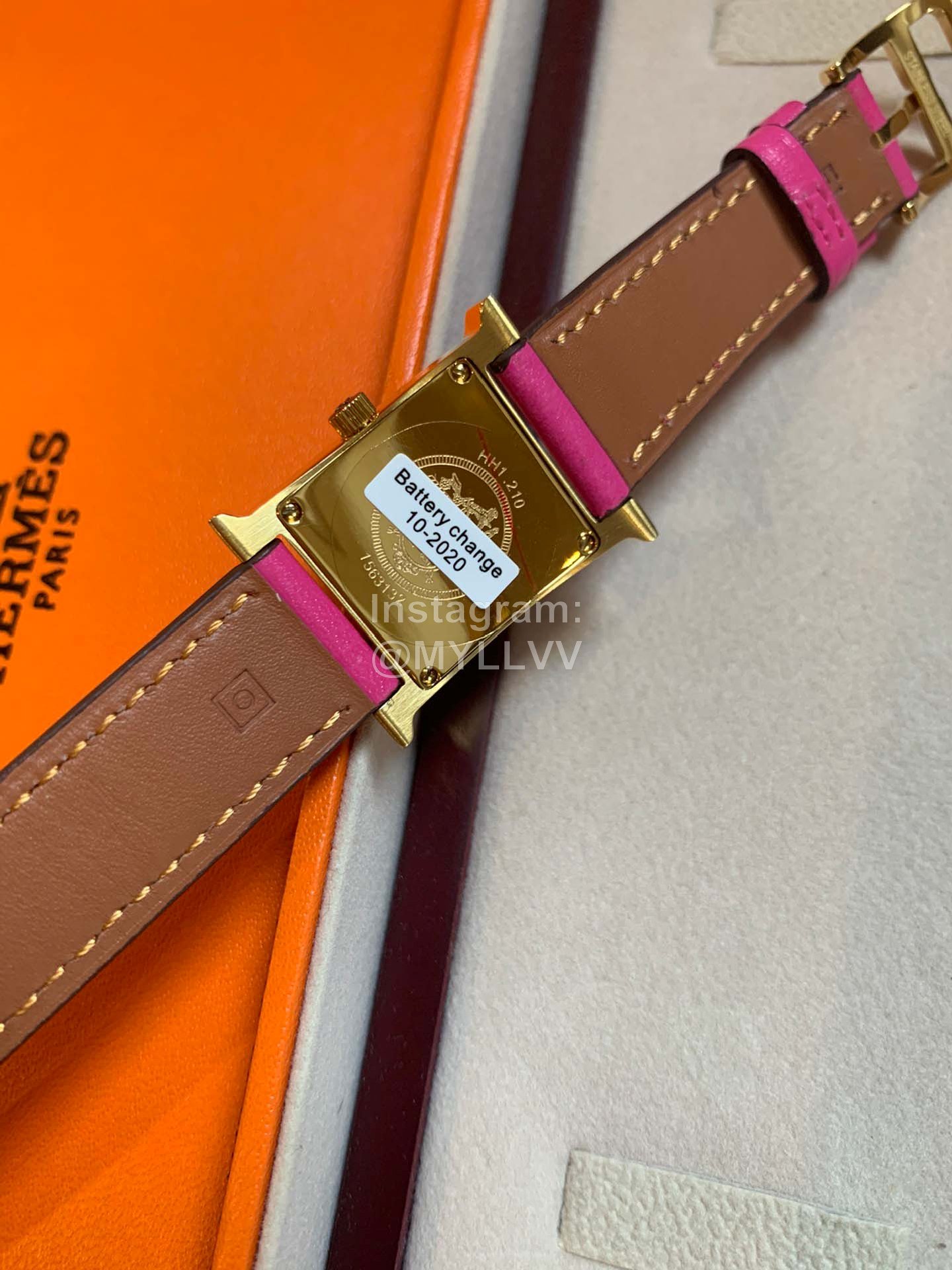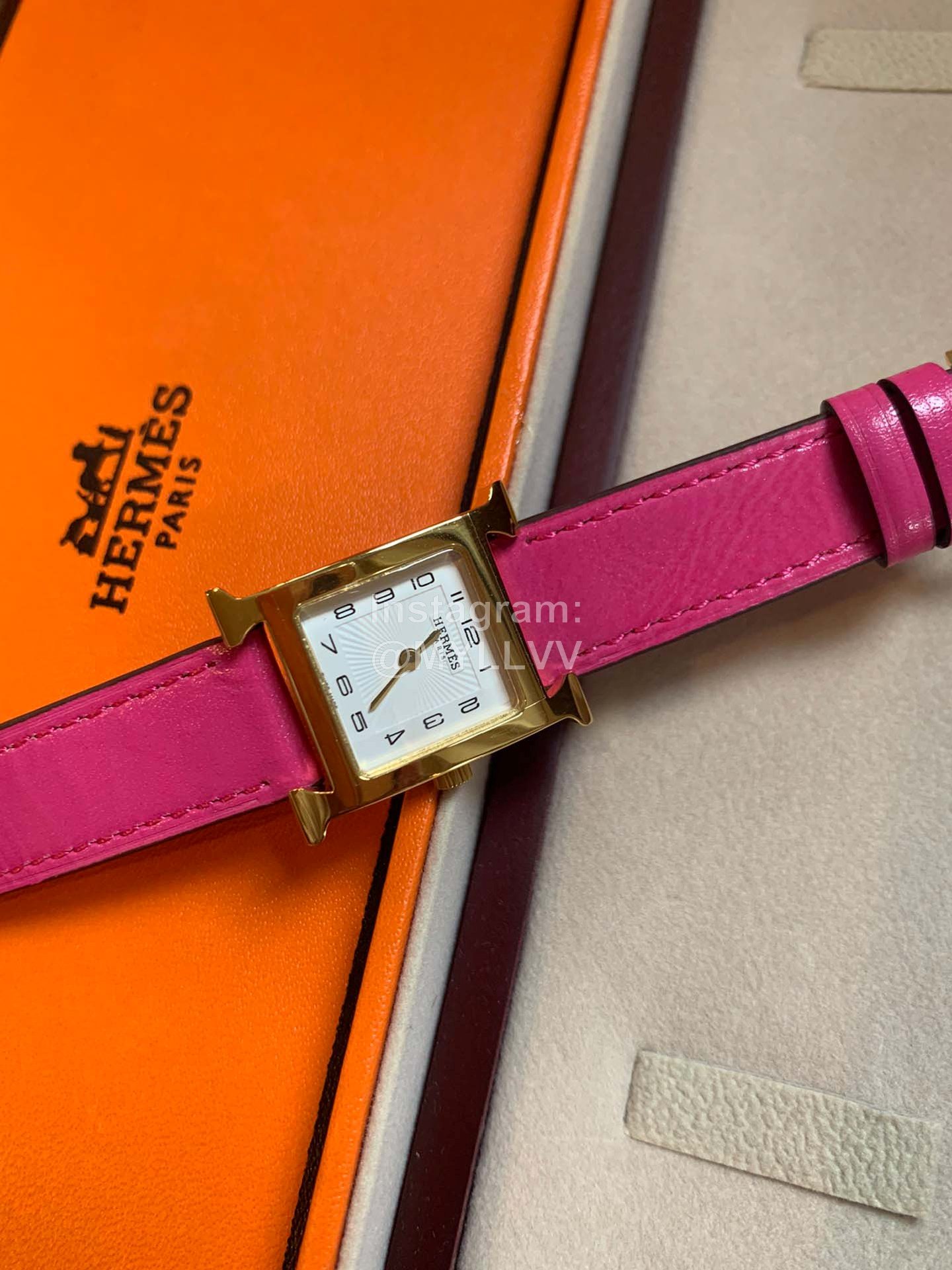 Hermes heure H series was launched simultaneously at DFS global duty-free shop in Hong Kong in 2021. The bright color strap surrounds the unique “H” case. The digital time scale and Pearl Fritillaria dial are additionally inlaid with 11 diamonds, Swiss quartz original gold movement, small 21mm, Italian pure handmade calf leather strap. The classic H shape is fashionable and versatile, with good starting temperament