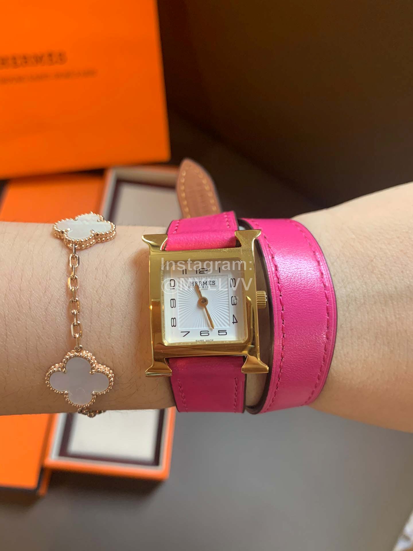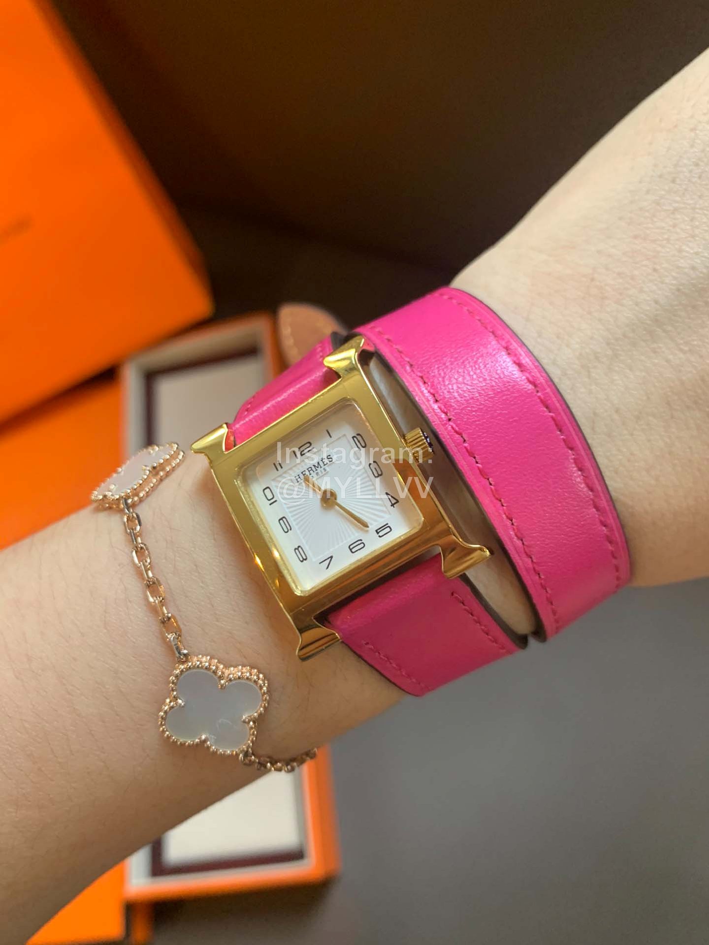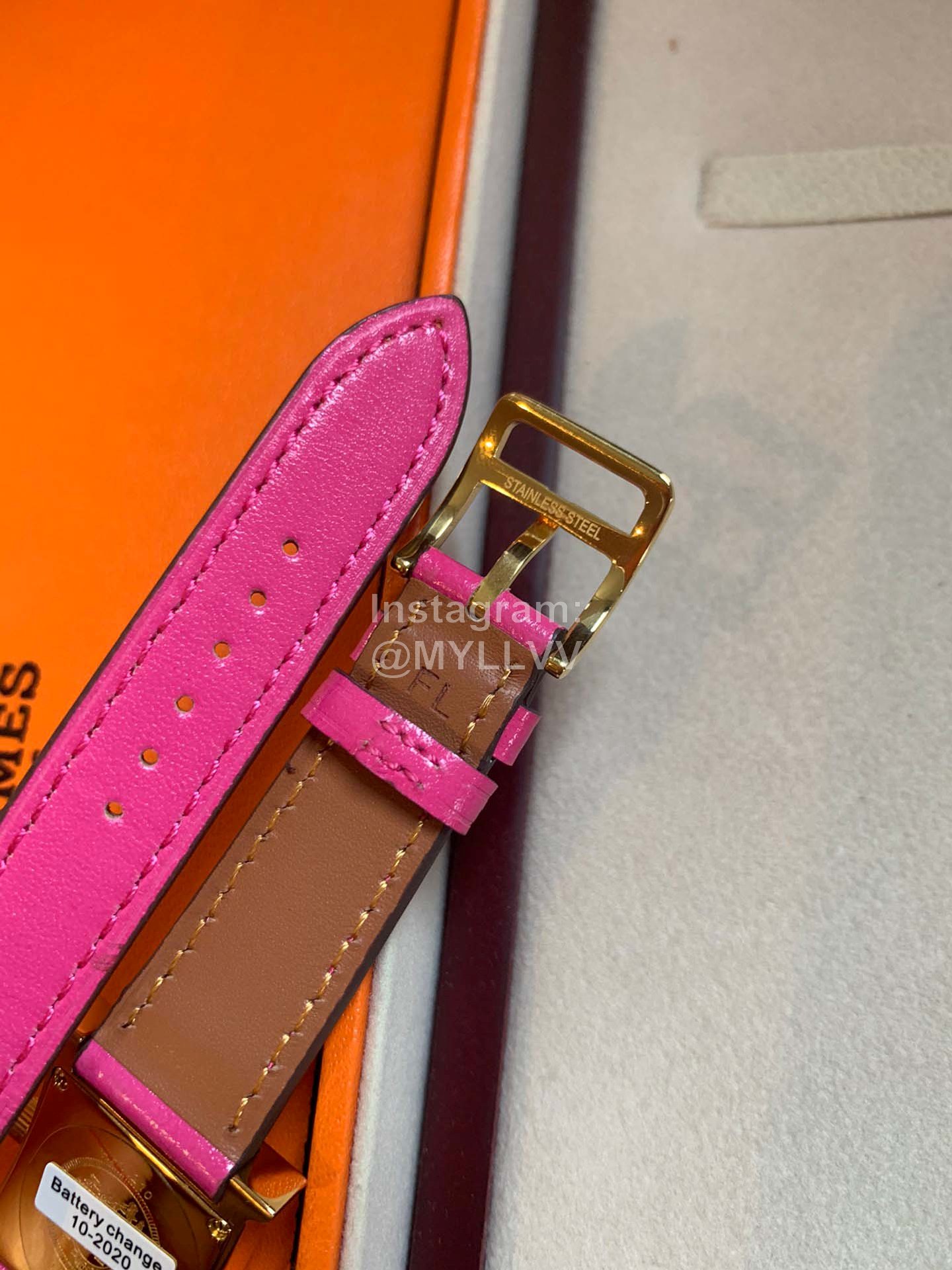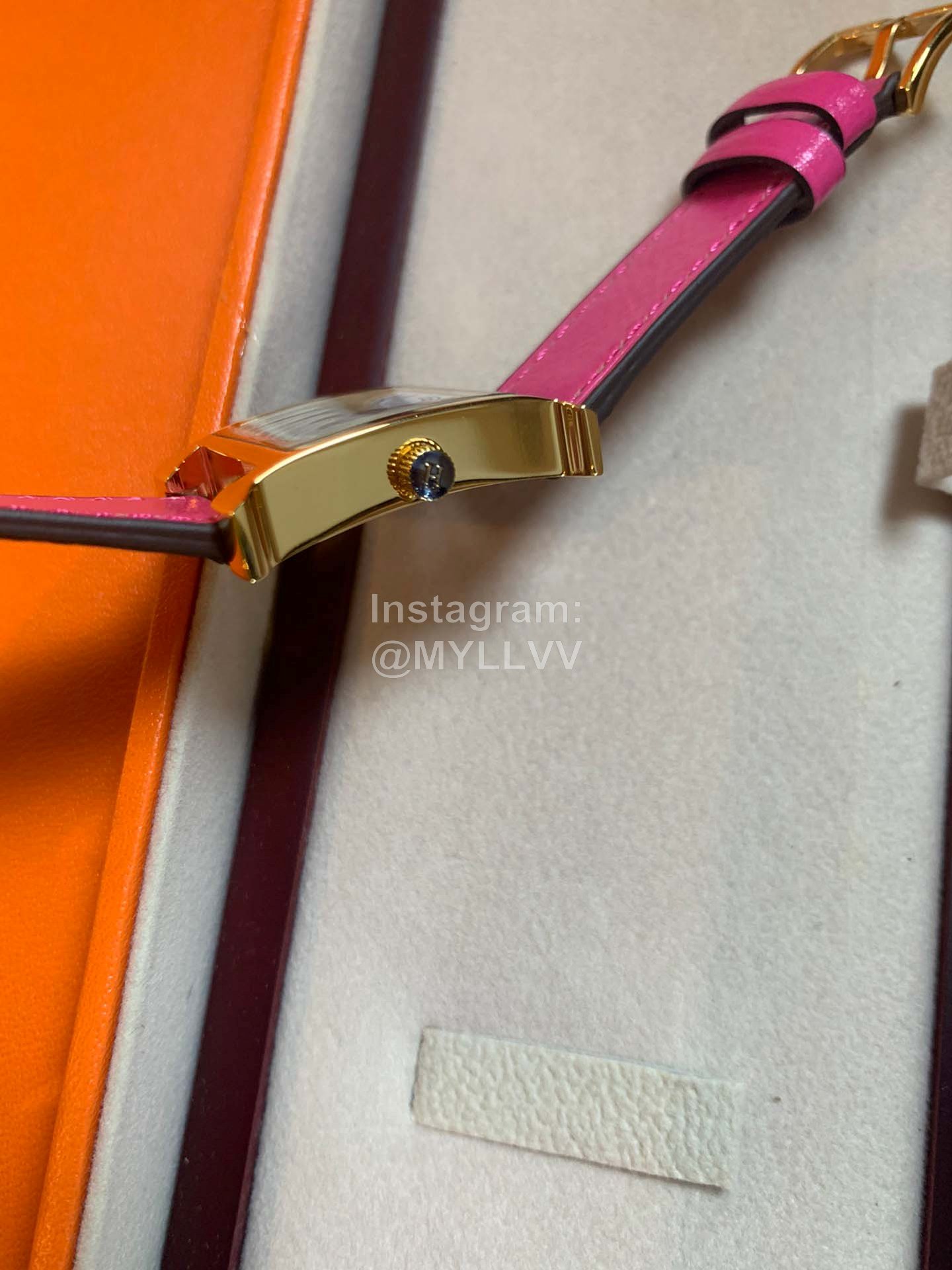 Hermes heure H series was launched simultaneously at DFS global duty-free shop in Hong Kong in 2021. The bright color strap surrounds the unique “H” case. The digital time scale and Pearl Fritillaria dial are additionally inlaid with 11 diamonds, Swiss quartz original gold movement, small 21mm, Italian pure handmade calf leather strap. The classic H shape is fashionable and versatile, with good starting temperament