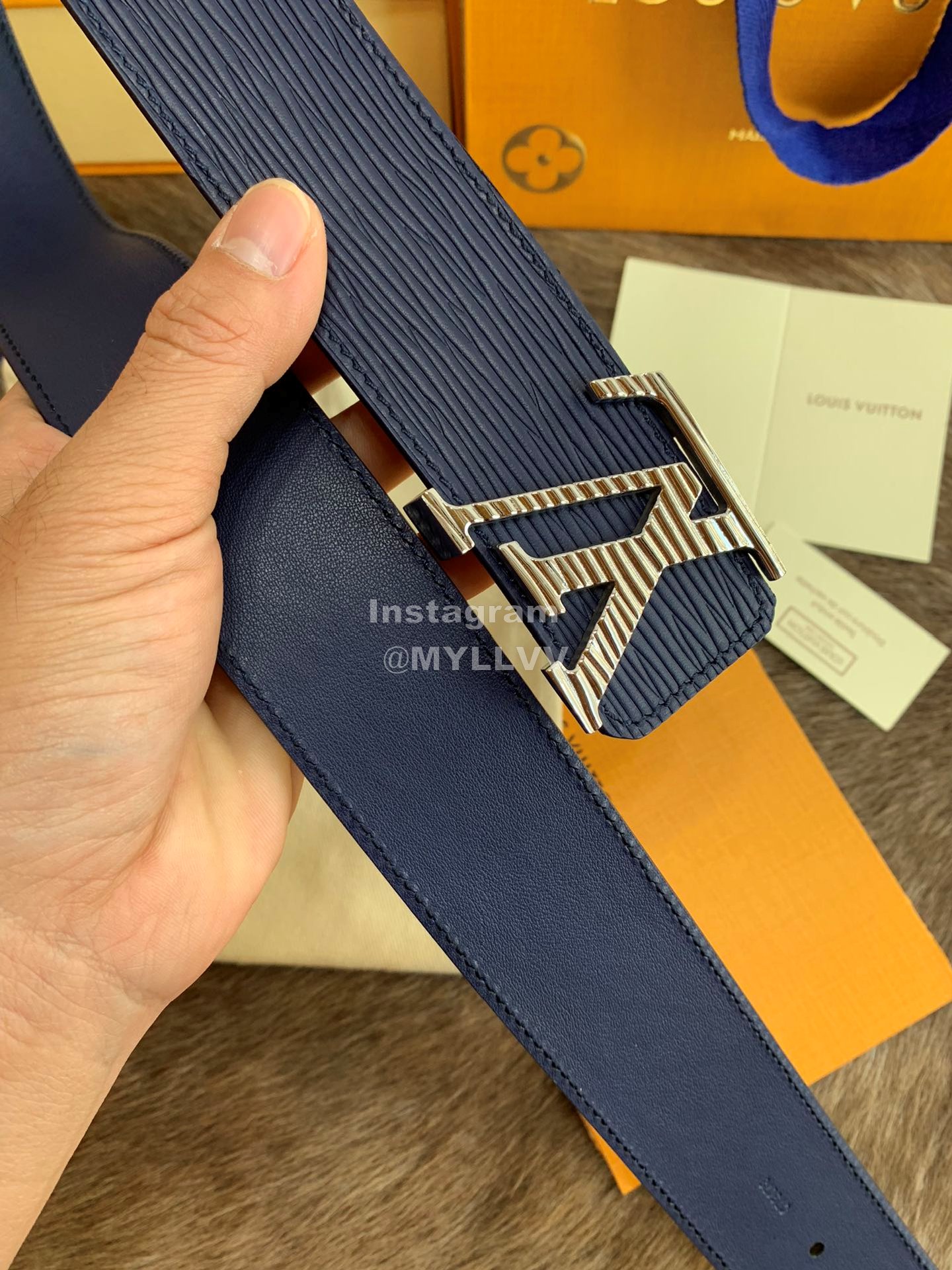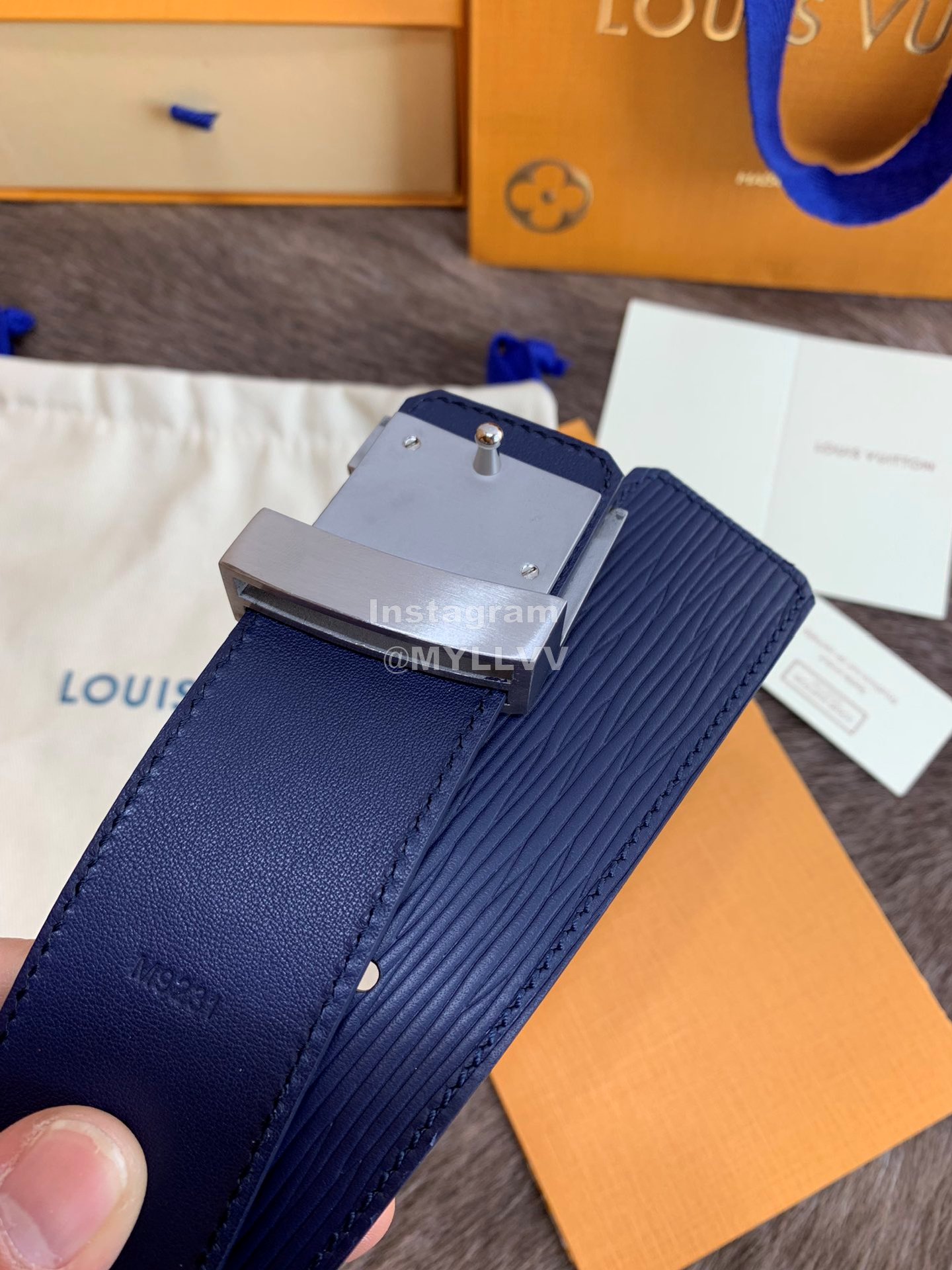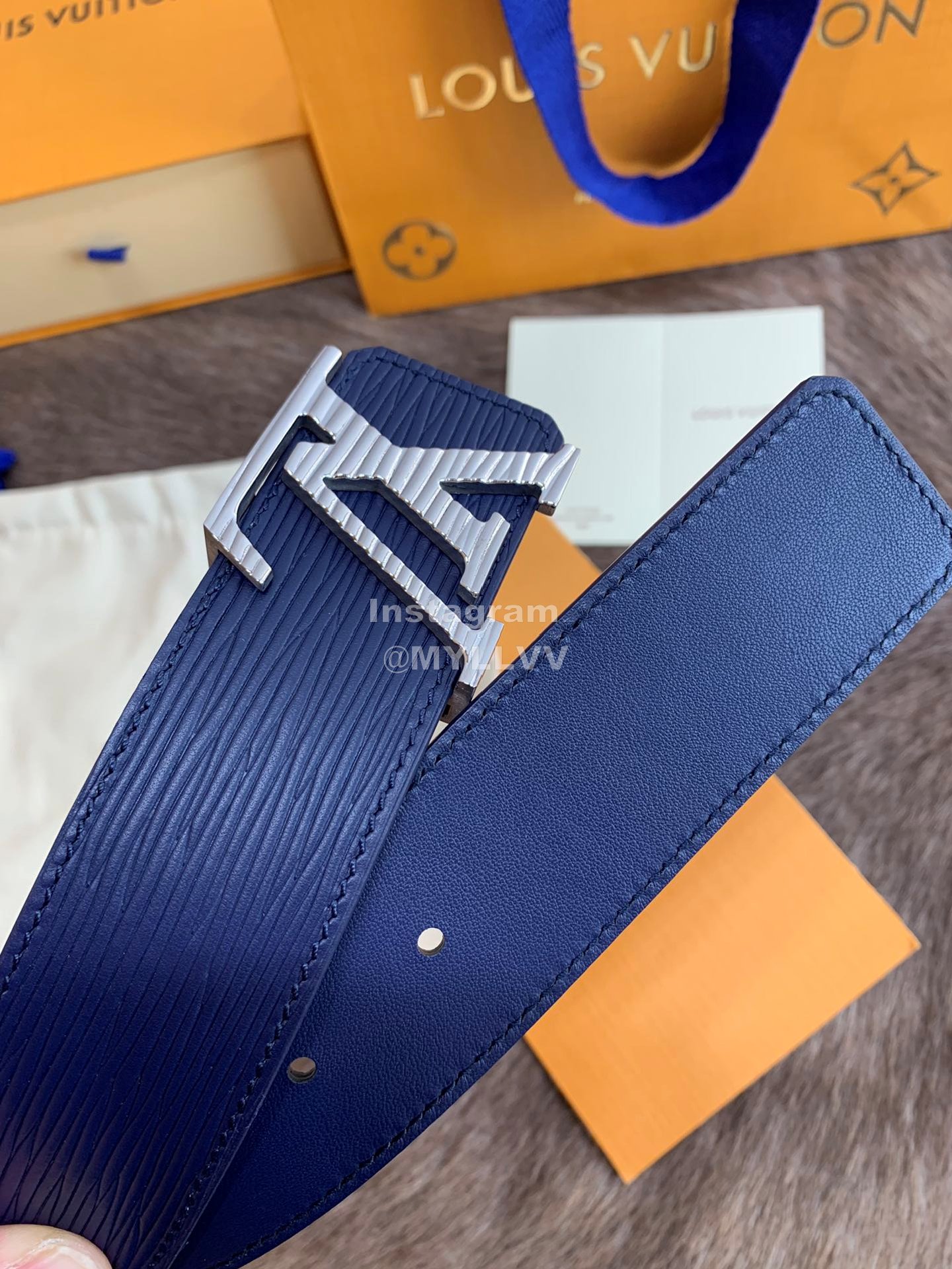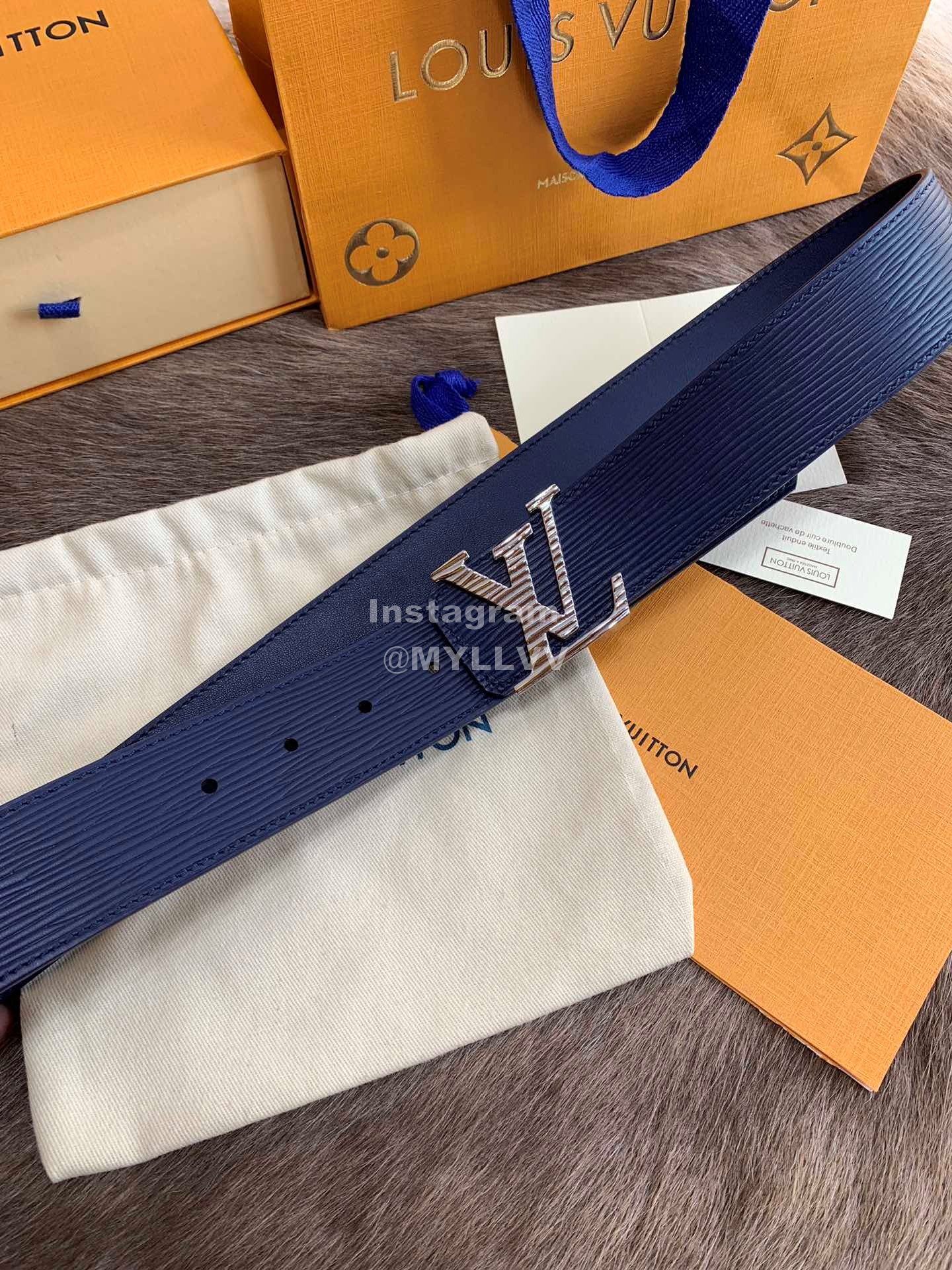 Lv New Leather Fine Steel Letter Buckle 40mm Belts For Men Blue