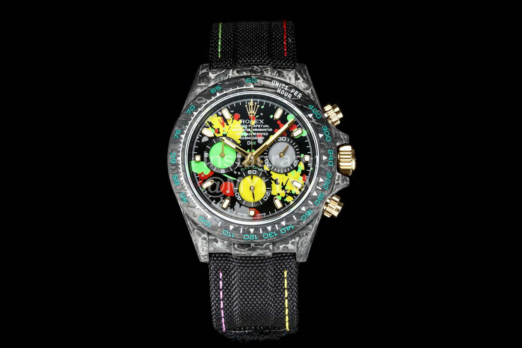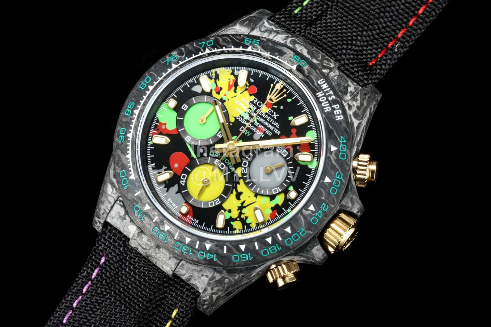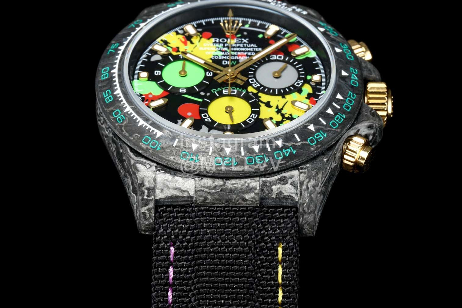 Rolex’s carbon fiber customized version is not only light to wear, but also hard to wear. And each watch has a unique carbon fiber pattern. [case] watch size 40×13 5. Match the original. Tw factory strength casts the unique style of carbon fiber Rolex. The whole shell cover, ring mouth and bottom cover are made of high composite carbon fiber and super luminous powder. The details are made by hand chamfering and polishing. Extraordinary texture. [strap buckle] the strap is made of artificial fiber woven belt, which is breathable, comfortable and soft. [movement] the precise and mature 7750 movement is adopted to perfectly realize the powerful function of genuine products!!!