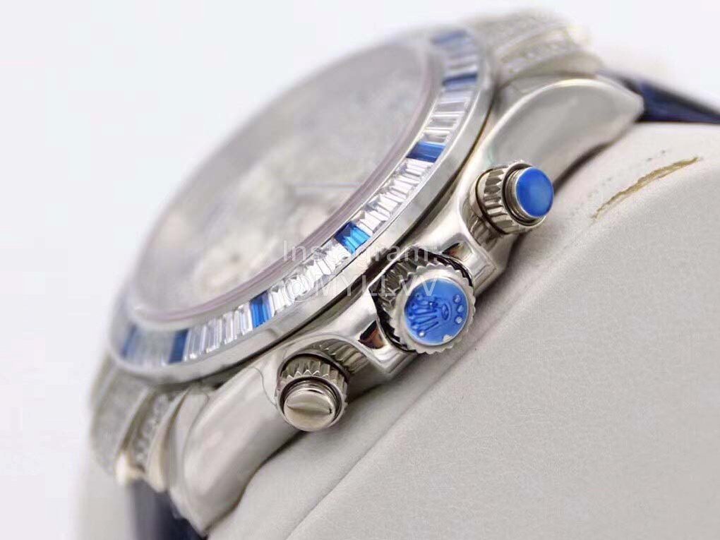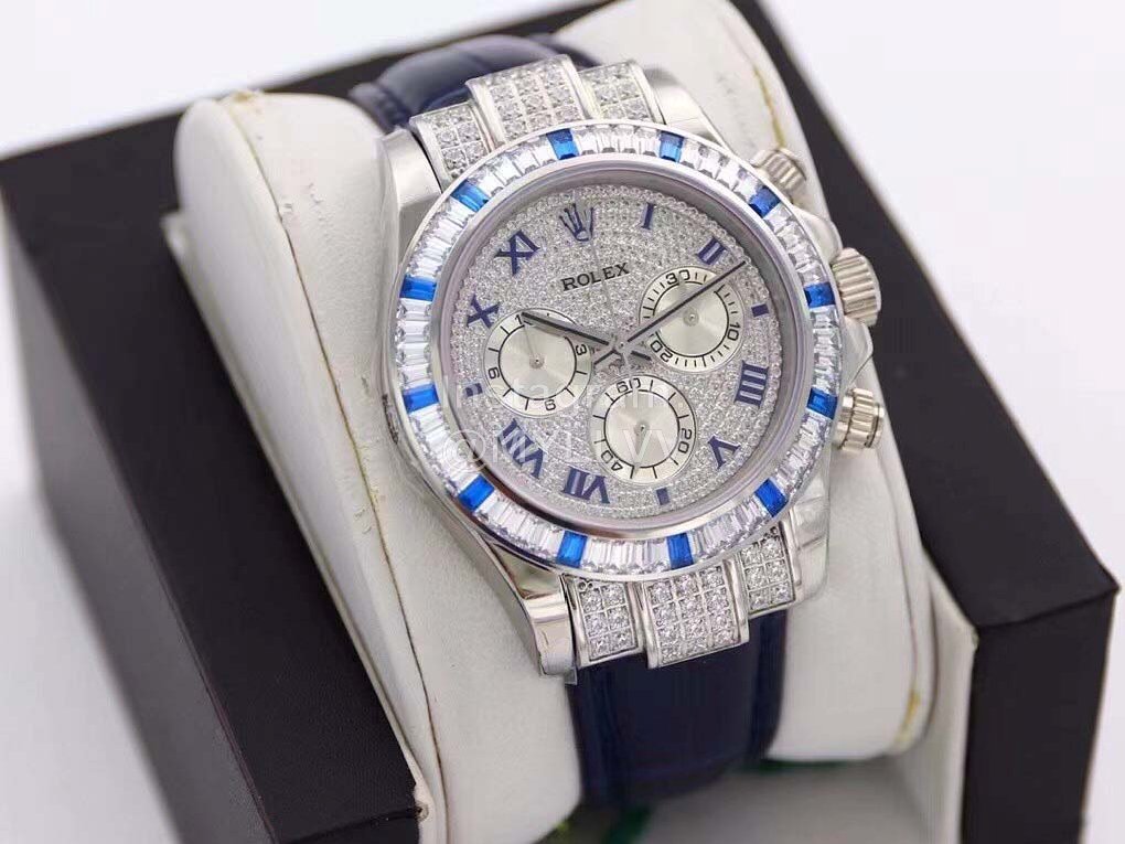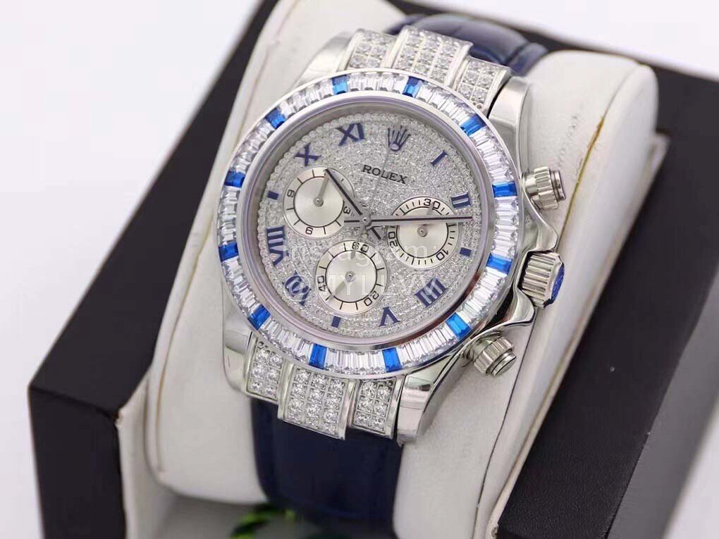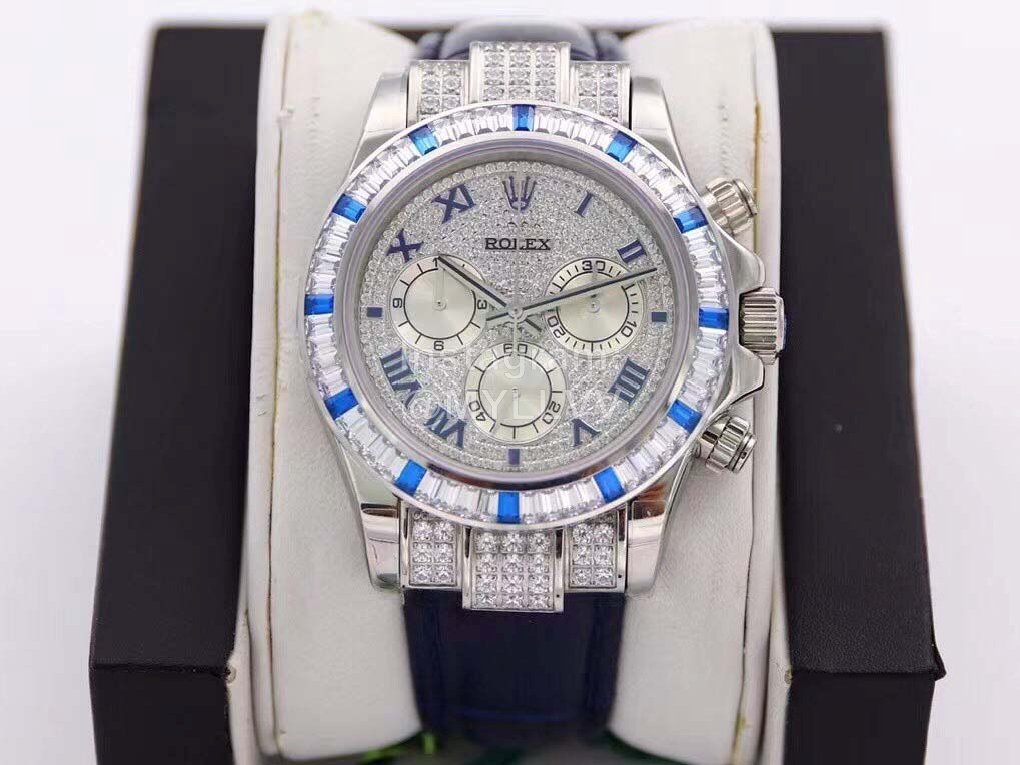 R7-f Rolex is inlaid with 116599 stars, 60 trapezoidal square diamonds are inlaid at the mouth of the ring, and 12 blue gemstones are known as “Twelve sapphires”. The biggest highlight of this watch is the 12 exquisite square sapphires on the ring, which reflect each other with the Roman numerals made of blue francs on the disk, giving the watch noble luster. Details 1 The timing dial is matched with a silver radial bright surface, which makes the finishing point lifelike, and the scale of the drill surface corresponds to the circle one by one. 2. The black thread needle in the flower of the reverse tube head batch with the same needle as the original one has high recognition. 3. 24 bright diamonds are embedded in the bilateral head grain, 6 on the left and right sides and 12 in the middle, perfectly highlighting the shining effect of the wings. 4. The steel seals on the four corners of the bottom cover are consistent with the original ones, namely dog head mark, precious metal mark, 750 mark and Rolex logo mark. The position of the middle ring is treated with fine grain wire drawing, and the bottom cover is low and flat, in an inverted ladder shape. It is very comfortable to wear on your hand. 5. The diameter of the watch is 40mm, with Rolex special screw in crown. 6. The watch buckle takes 2 years to create a double safety buckle consistent with the original. The scale on the back is consistent with the original precious metal mark. The exquisite printed watch buckle adds luster to the connotation of the whole watch