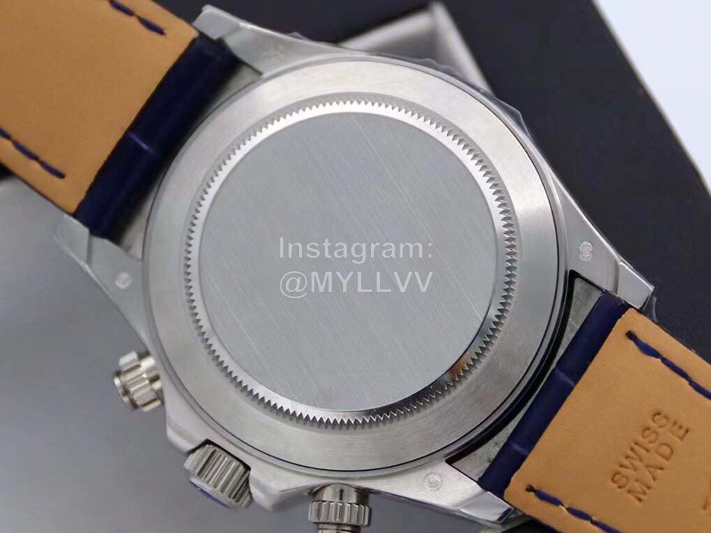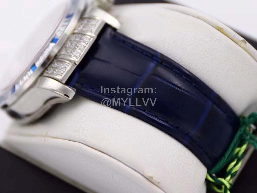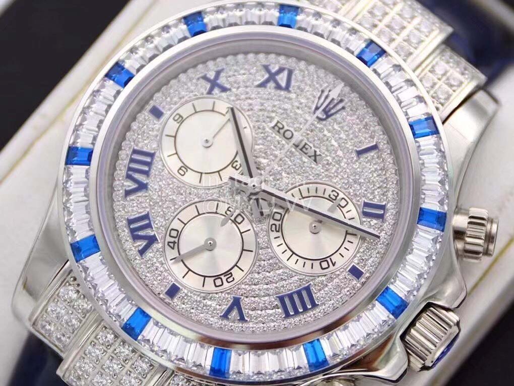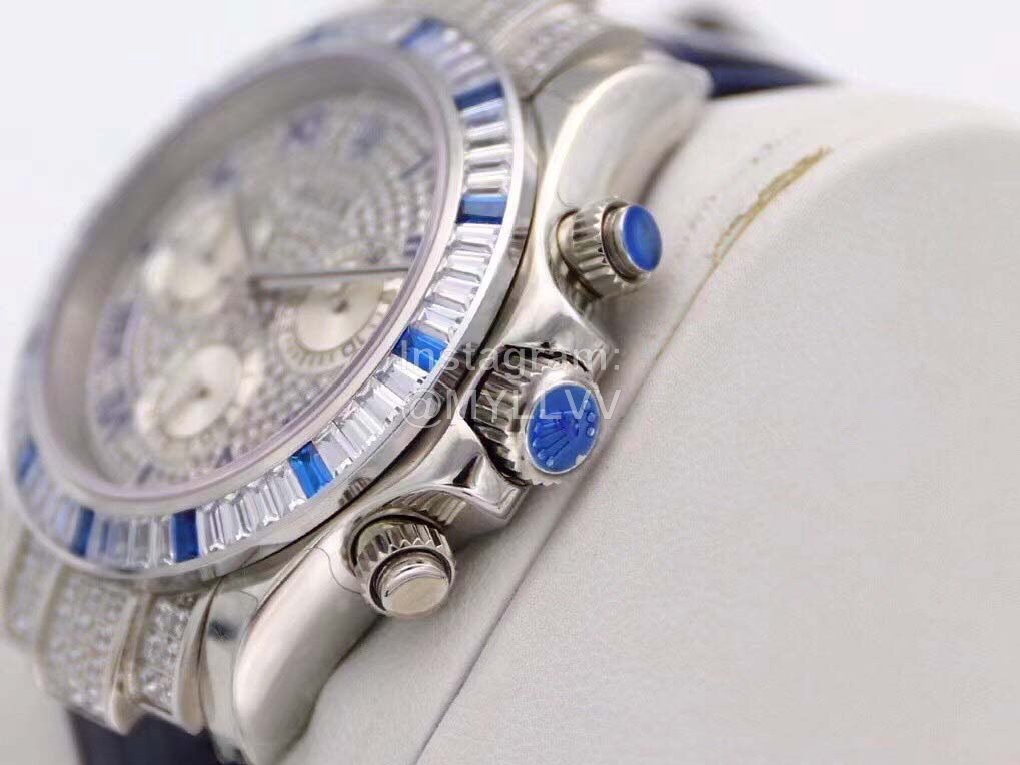 R7-f Rolex is inlaid with 116599 stars, 60 trapezoidal square diamonds are inlaid at the mouth of the ring, and 12 blue gemstones are known as “Twelve sapphires”. The biggest highlight of this watch is the 12 exquisite square sapphires on the ring, which reflect each other with the Roman numerals made of blue francs on the disk, giving the watch noble luster. Details 1 The timing dial is matched with a silver radial bright surface, which makes the finishing point lifelike, and the scale of the drill surface corresponds to the circle one by one. 2. The black thread needle in the flower of the reverse tube head batch with the same needle as the original one has high recognition. 3. 24 bright diamonds are embedded in the bilateral head grain, 6 on the left and right sides and 12 in the middle, perfectly highlighting the shining effect of the wings. 4. The steel seals on the four corners of the bottom cover are consistent with the original ones, namely dog head mark, precious metal mark, 750 mark and Rolex logo mark. The position of the middle ring is treated with fine grain wire drawing, and the bottom cover is low and flat, in an inverted ladder shape. It is very comfortable to wear on your hand. 5. The diameter of the watch is 40mm, with Rolex special screw in crown. 6. The watch buckle takes 2 years to create a double safety buckle consistent with the original. The scale on the back is consistent with the original precious metal mark. The exquisite printed watch buckle adds luster to the connotation of the whole watch