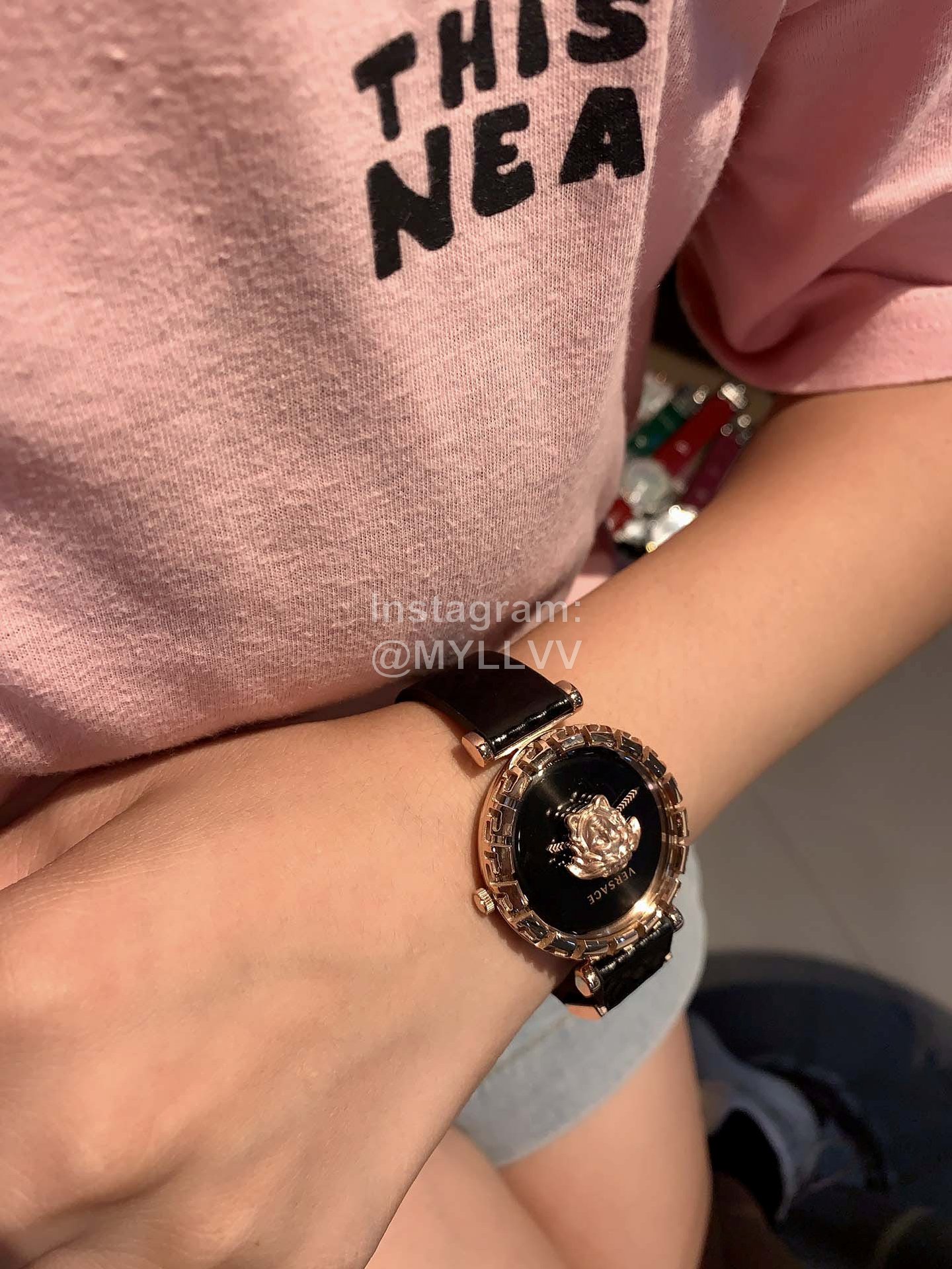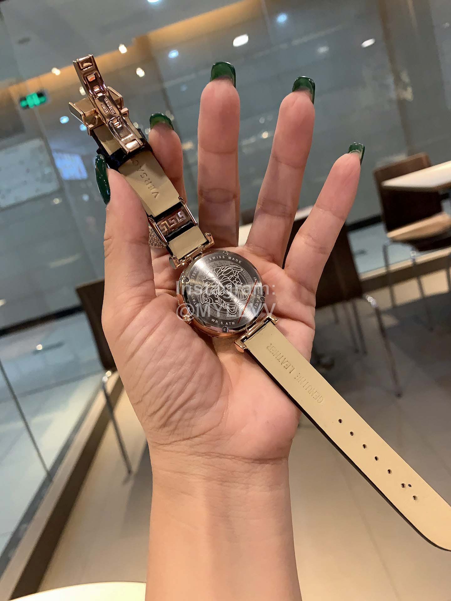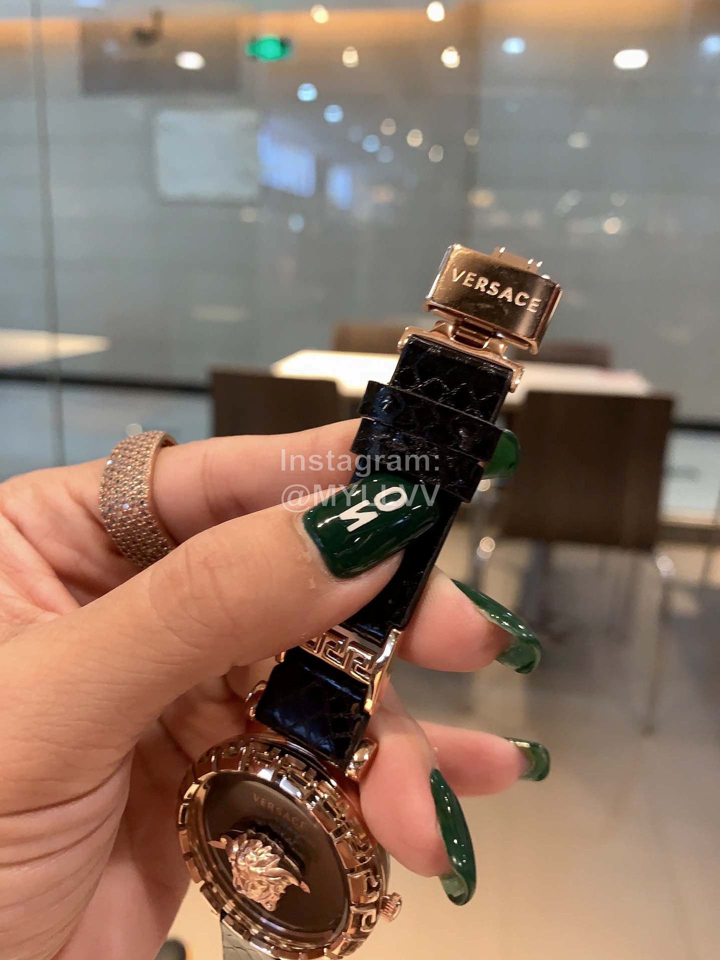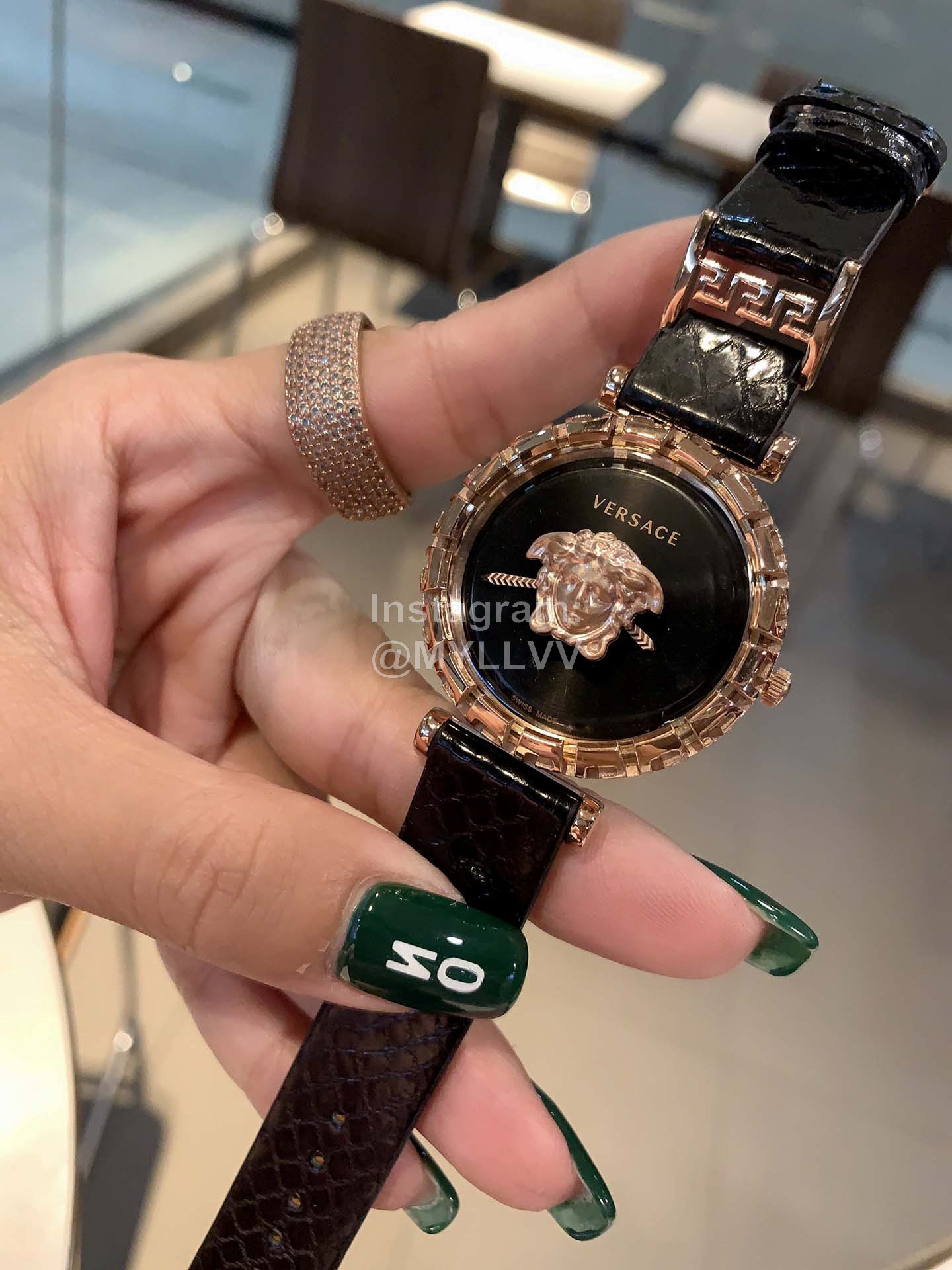 New – Versace this Palazzo Empire Greek wristwatch is decorated with a medusa in the center of the dial, and the case is engraved with Greek wristbands, which is quite gorgeous. The dial is dotted with the Versace logo at 12 o’clock. Case: 37mm, 2-pin quartz Swiss movement, resin glass decorated with 3D Medusa, Greek palindrome top ring.