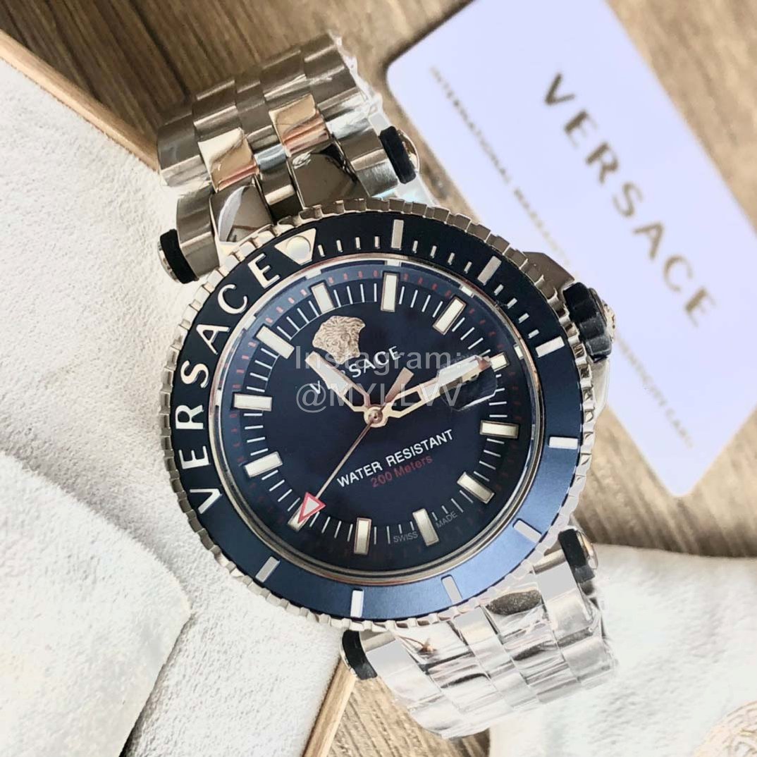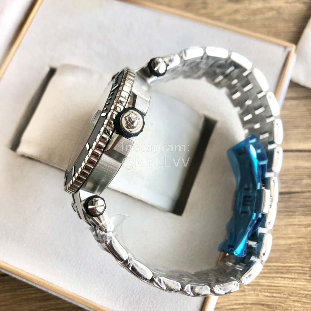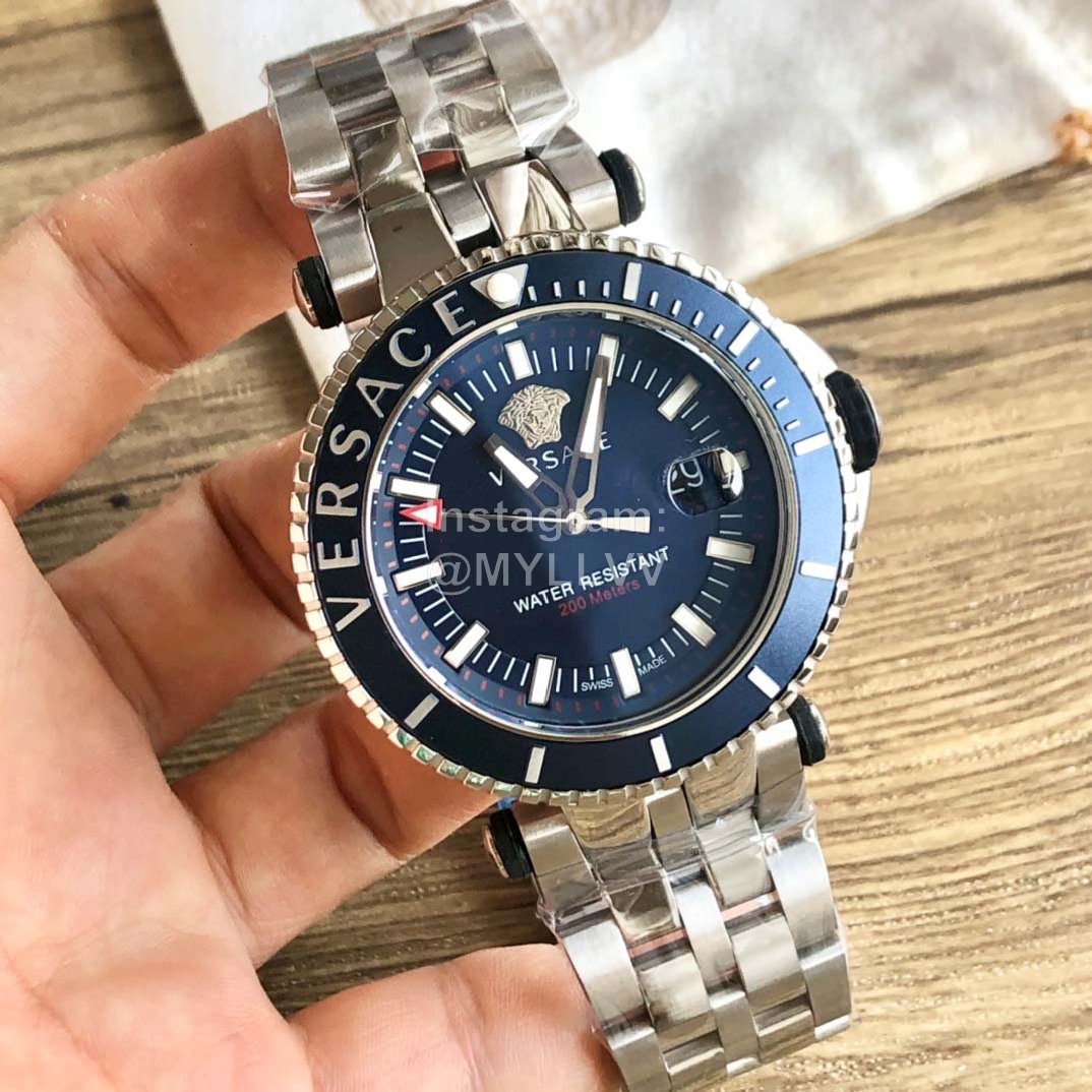Versace Medusa single rotating ring steel band sports diving Large Dial Men’s watch, with brand logo engraved on the outer ring, 12 o’clock large dot super luminous, imported quartz movement, hard sapphire glass, stainless steel strap and double snap buckle system, easy and fast to open, with an outer diameter of 46mm