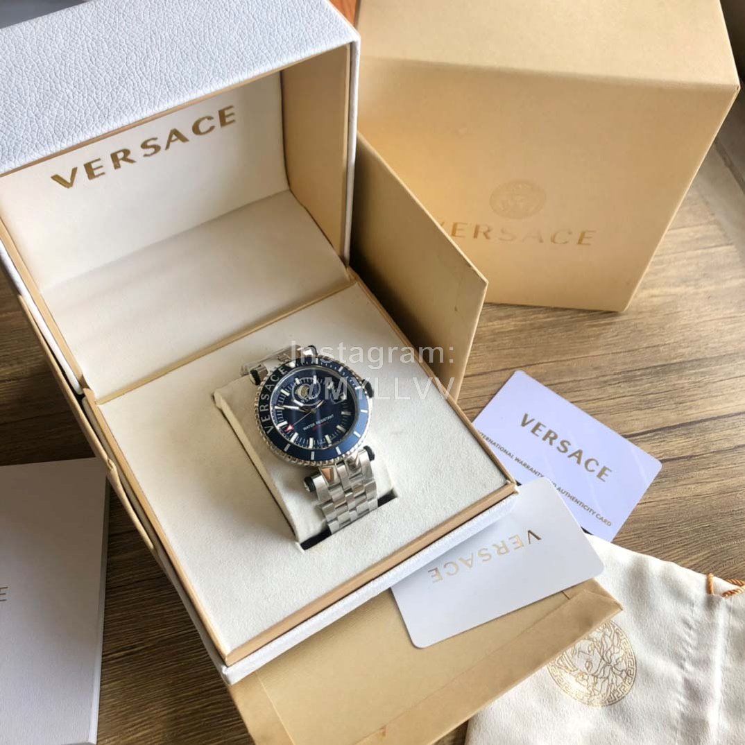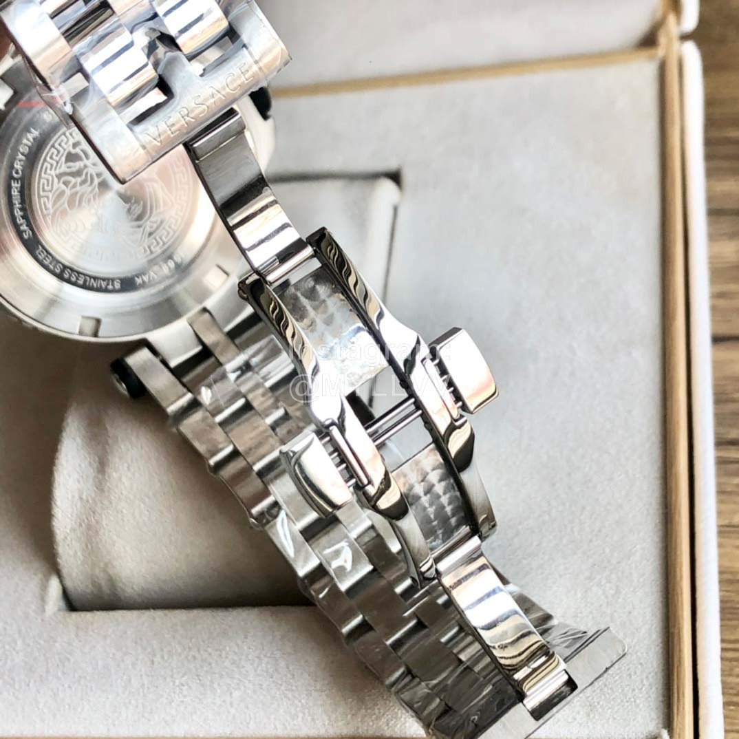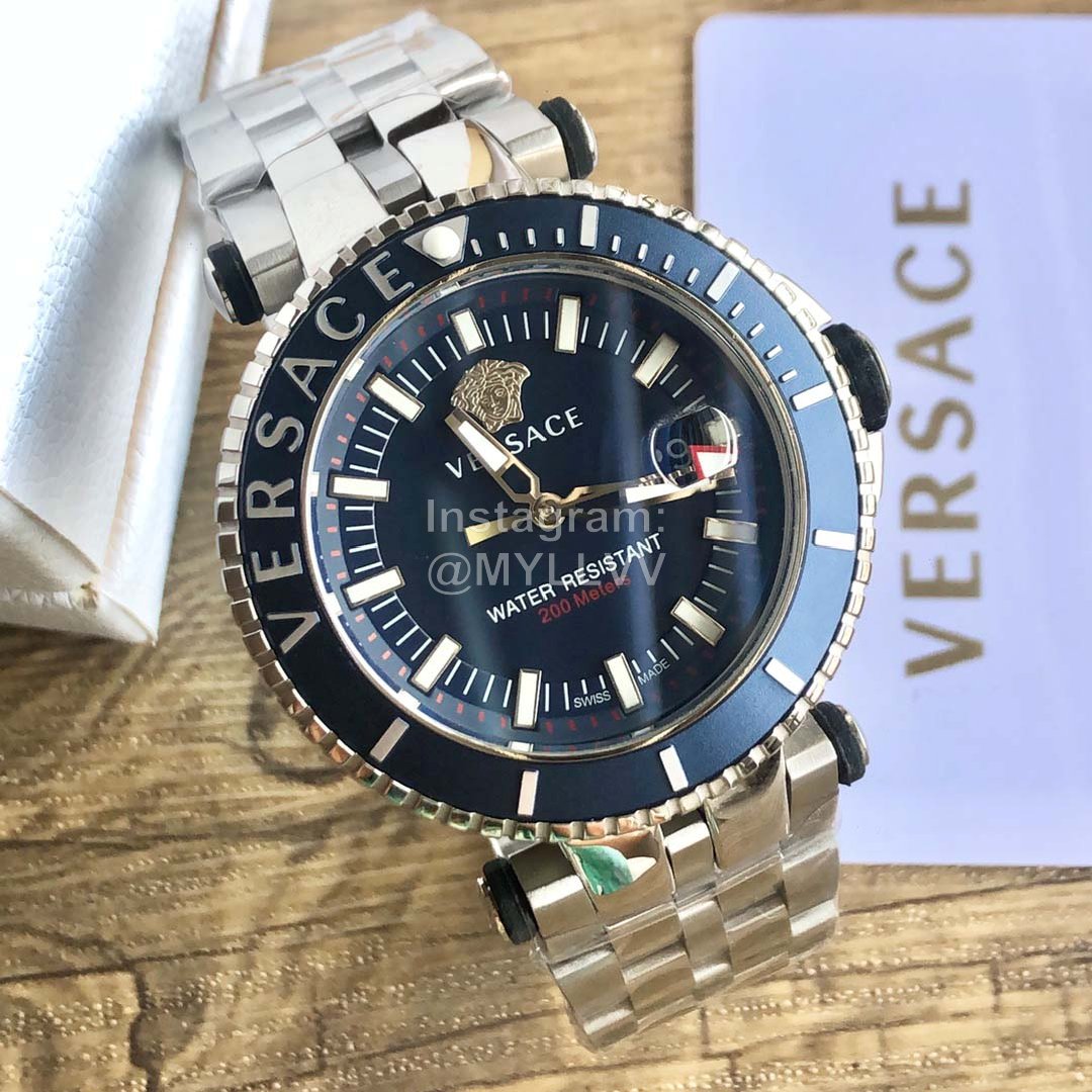 Versace Medusa single rotating ring steel band sports diving Large Dial Men’s watch, with brand logo engraved on the outer ring, 12 o’clock large dot super luminous, imported quartz movement, hard sapphire glass, stainless steel strap and double snap buckle system, easy and fast to open, with an outer diameter of 46mm